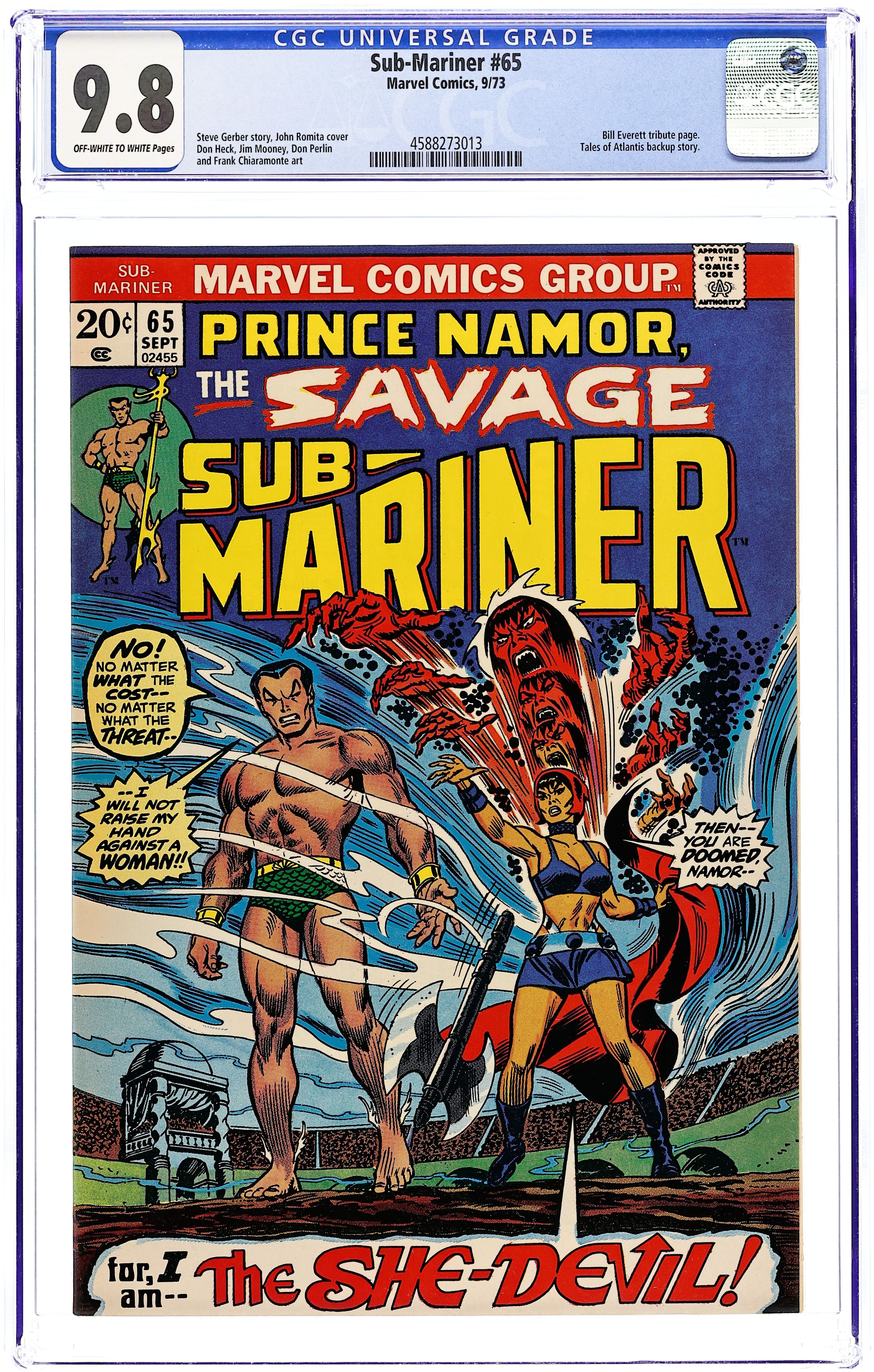 Cover by John Romita. "The Cry of the She-Beast!", script by Steve Gerber, pencils by Don Heck, inks by Don Perlin; Namor is led into the arena where he confronts his opponent, Virago the warrior queen; She calls upon some mystical force and is transformed into a raging She-Beast!; She attacks Namor and he does his best against her, but Virago proves to be too much for him; She then decides to lead a scout ship across the dimensions and attack Atlantis. Tales of Atlantis back-up story, "The Lurker In the Ruins!", script by Steve Gerber, pencils by Jim Mooney, inks by Frank Chiaramonte. Full-page tribute to Bill Everett, who passed away in February 1973. 36 pgs., full color. $0.20. Cover price $0.20. Grade: CGC 9.8 explanation of grade Condition: Used (collectible)