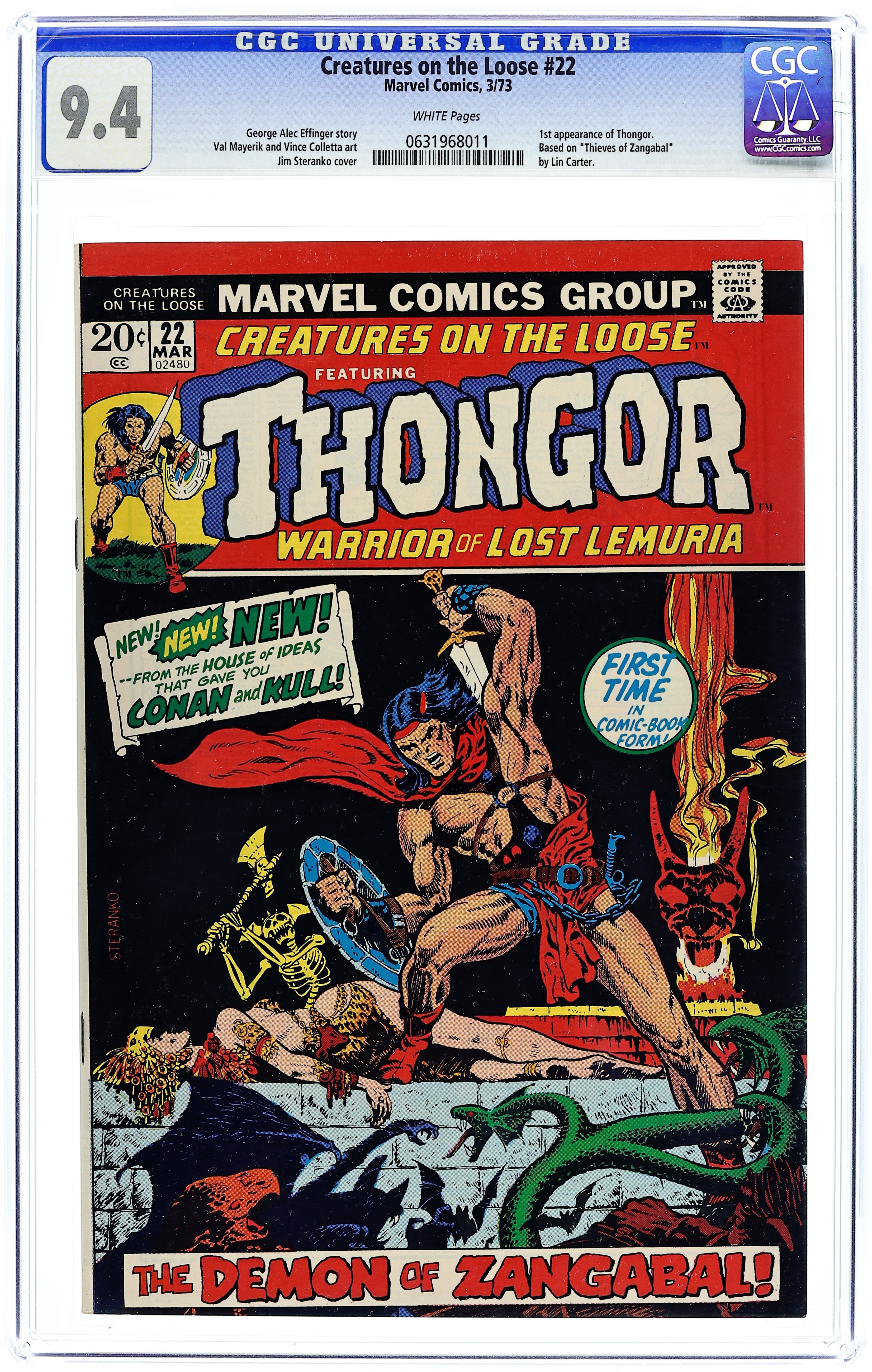 Starts Feb 2 First comic book appearance of Thongor in "Thongor, Warrior of Lost Lemuria!" Script by George Alec Effinger, pencils by Val Mayerik, inks by Vince Colletta (based on the Lin Carter story "Thieves of Zangabal"). Reprint: "Gundar!" with script by Stan Lee, art by Steve Ditko. Jim Steranko cover. Cover price $0.20. Grade: CGC 9.4 explanation of grade Condition: Used (collectible)