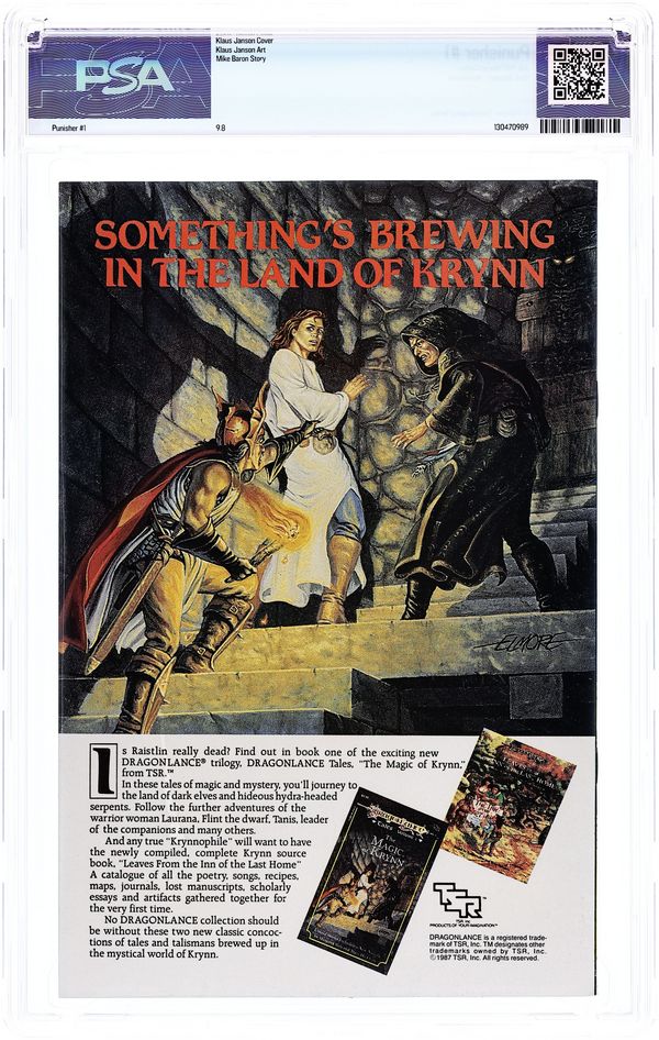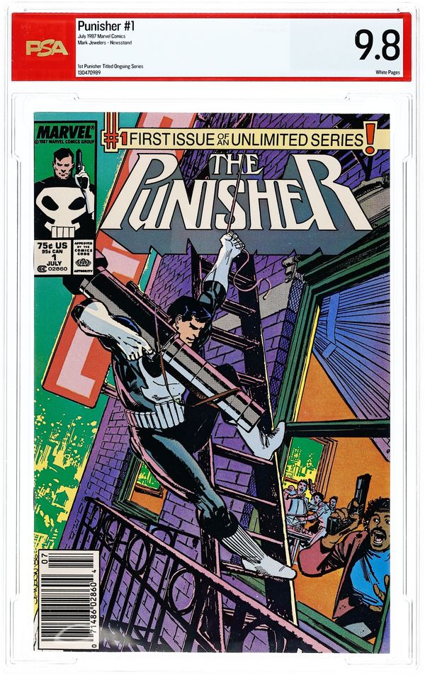 Mark Jewelers Advertisement Insert Variant. Story by Mike Baron. Art by Klaus Janson. Vietnam vet Frank Castle's wife and children were caught in the crossfire of warring crime families. Now, he's back and they're all going to pay. All of them. Those that visit harm on others will come to know him as the Punisher. Frank starts up his first ongoing series with guns blazing. His first target, a drug dealer who thinks he's above the law. Well, he's not above Punishment. 32 pages. Cover price $0.75. Grade: PSA 9.8 explanation of grade Condition: Used (collectible)
