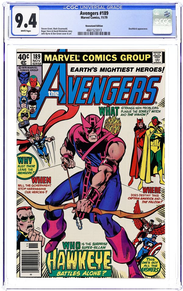 Starts Feb 2 Newsstand Edition. "Wings and Arrows!" Plot by Steven Grant, Mark Gruenwald and Roger Stern. Script by Steven Grant. Pencils by John Byrne. Inks by Dan Green. Cover by John Byrne and Terry Austin. The Avengers' titanic tussle with Arsenal (in Avengers Annual 9) is over. And now the team is getting back to normal and re-establishing the government-mandated seven person roster. But Clint Barton is not on that roster, so the Avengers' former ace archer must find another job. Hawkeye receives a nice lead from Jarvis and lands a security position with Cross Enterprises! However trouble isn't too far behind, and just a few days later Hawkeye gets to strut his stuff vs. the Shi'ar warrior...Deathbird! Cameo appearances by Peter Gyrich and Jocasta. (Notes: Deathbird appears next in Uncanny X-Men 155.) 36 pages Cover price $0.40. Grade: CGC 9.4 explanation of grade Condition: Used (collectible)