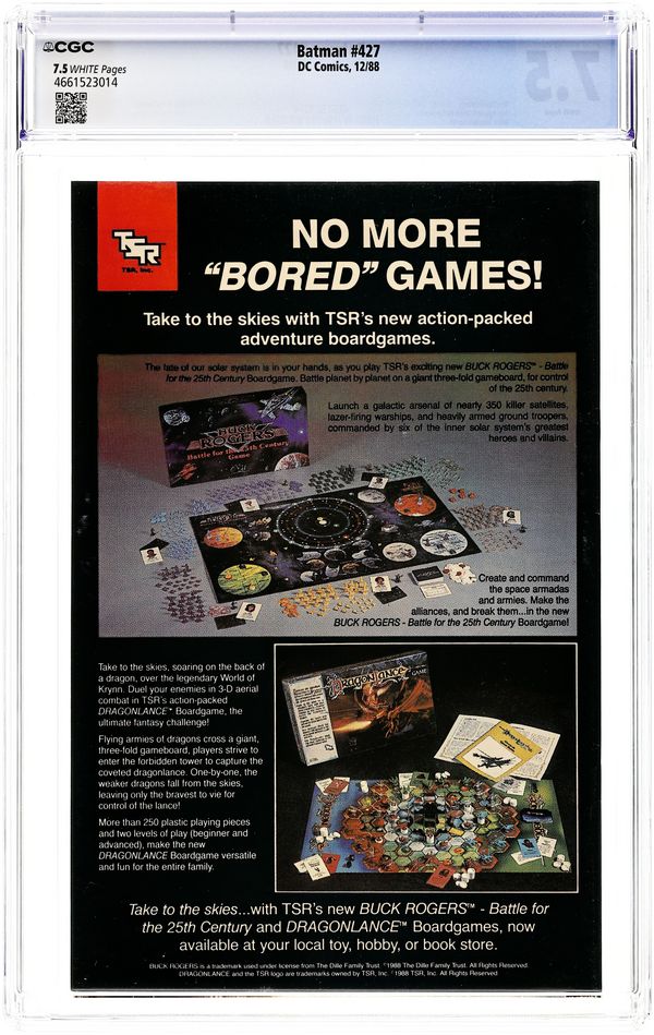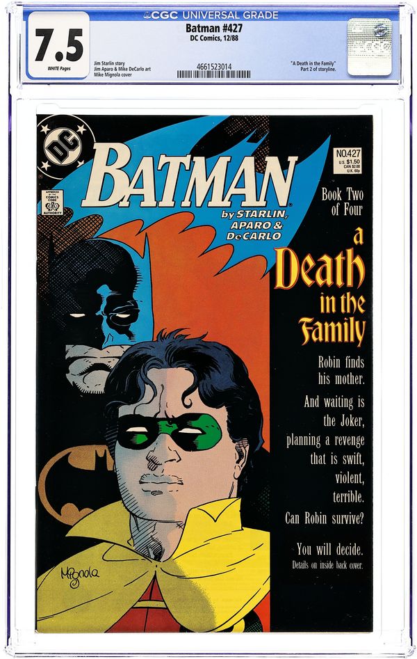 Starts Feb 2 First printing. Direct Edition. Cover art by Mike Mignola. "A Death in the Family" part 2 of 4, script by Jim Starlin, pencils by Jim Aparo, inks by Mike DeCarlo; Jason meets his real mother, Sheila Haywood, but she turns out to be working for the Joker and allows her son to fall into his deadly hands inside of a warehouse; Joker beats Robin with a crowbar and leaves him for dead as a badly beaten Robin attempts to save his mom and himself from the dynamite left behind by the Joker as he leaves them both to a horrible fate; Batman watches in horror as the warehouse containing Jason and Sheila blows up, too late to stop the Joker. Infamous Phone Poll on death or life for Robin (Jason Todd). The Direct Sales copies of this comic, released first, contained a 1-800 phone number to either vote "for" or "against" the death of Jason Todd on the inside back cover. The newsstand copies, released 3 weeks later did not contain the 1-800 number. NOTE: Most issues from 397-432 were reprinted in 1989 and sold in multipacks. These 2nd and 3rd prints have back cover ads dated 1989. 52 Pages, Full Color. Cover price $1.50. Grade: CGC 7.5 explanation of grade Condition: Used (collectible)