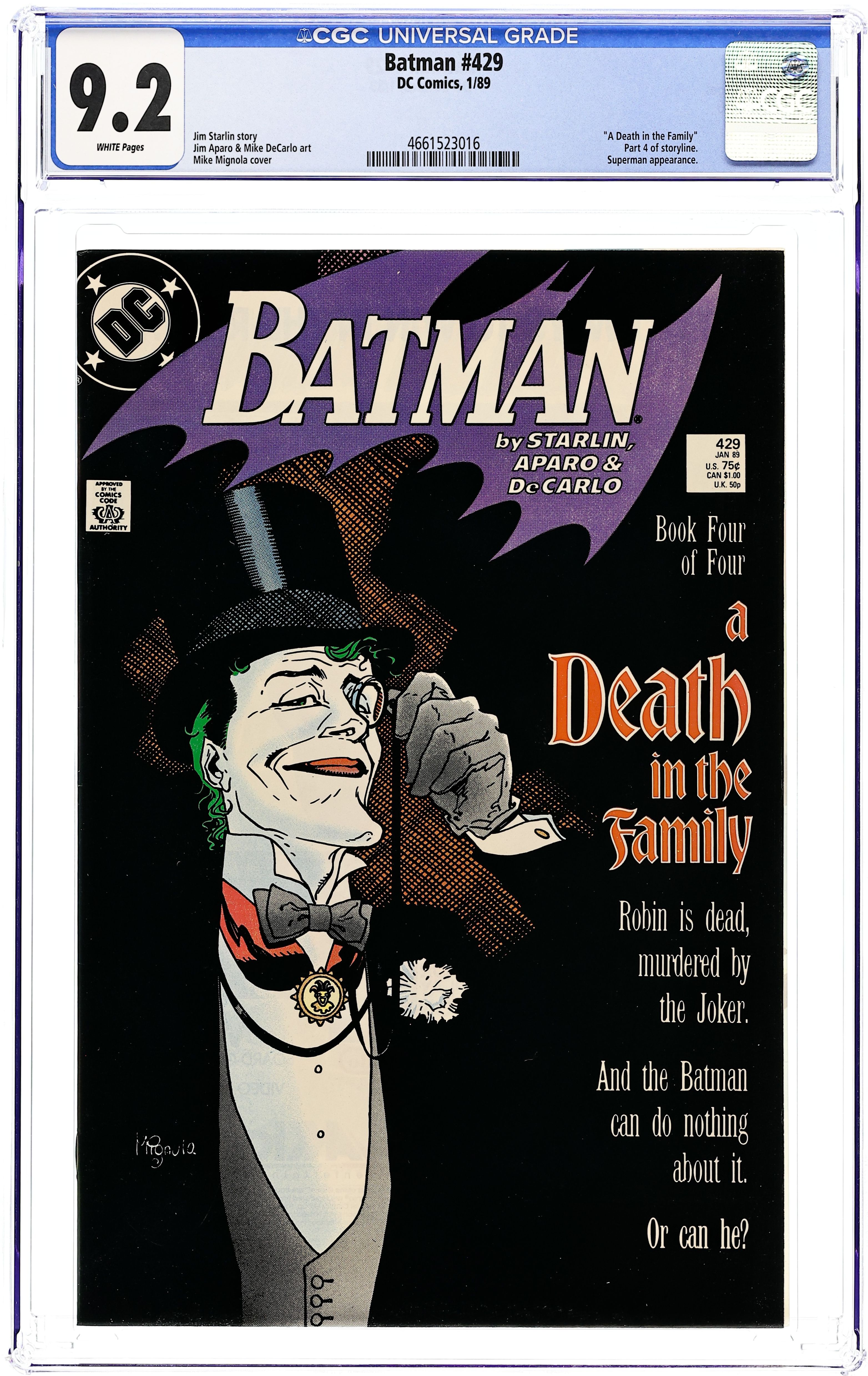 Starts Feb 2 First printing. Direct Edition. Cover art by Mike Mignola. "A Death in the Family" part 4 of 4, script by Jim Starlin, pencils by Jim Aparo, inks by Mike DeCarlo; Batman and Superman talk to CIA agent Ralph Bundy about the Joker's diplomatic status; The agent tries to get Batman to leave the Joker alone; Batman goes to the Joker's hotel room; The Joker confirms that he killed Jason; The Joker pulls a gun, but Batman is already gone; At the UN the Joker tries to poison the audience; Fortunately, Superman sucks up all the poison and flies out of the room to release it; The Joker activates bombs; Batman pursues him. NOTE: Most issues from 397-432 were reprinted in 1989 and sold in multipacks. These 2nd and 3rd prints have back cover ads dated 1989. 36 Pages, Full Color. Cover price $0.75. Grade: CGC 9.2 explanation of grade Condition: Used (collectible)