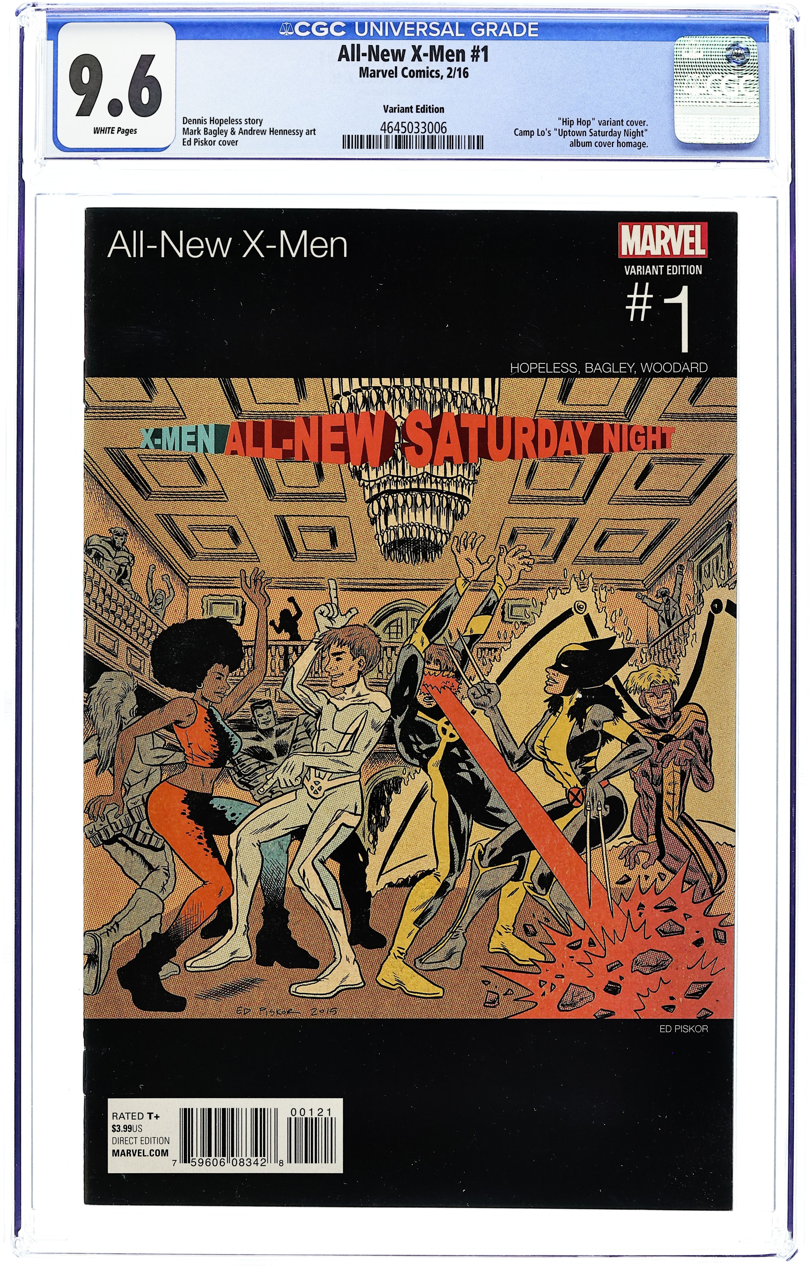 Starts Feb 2 Hip Hop Variant Cover by Ed Piskor. Written by Dennis Hopeless. Art by Mark Bagley. Hated and feared more than ever, the world is a dangerous place for mutants. As the few remaining X-MEN retreat into seclusion, a handful of mutant teenagers refuse to allow their destiny to be decided for them. CYCLOPS. BEAST. ICEMAN. ANGEL. THE ALL-NEW WOLVERINE. KID APOCALYPSE. OYA. Stepping out of the shadows of their predecessors, the ALL-NEW X-MEN are striking out on their own, determined to write their own futures! 28 pages, full color. Rated T+ Cover price $3.99. Grade: CGC 9.6 explanation of grade Condition: Used (collectible)