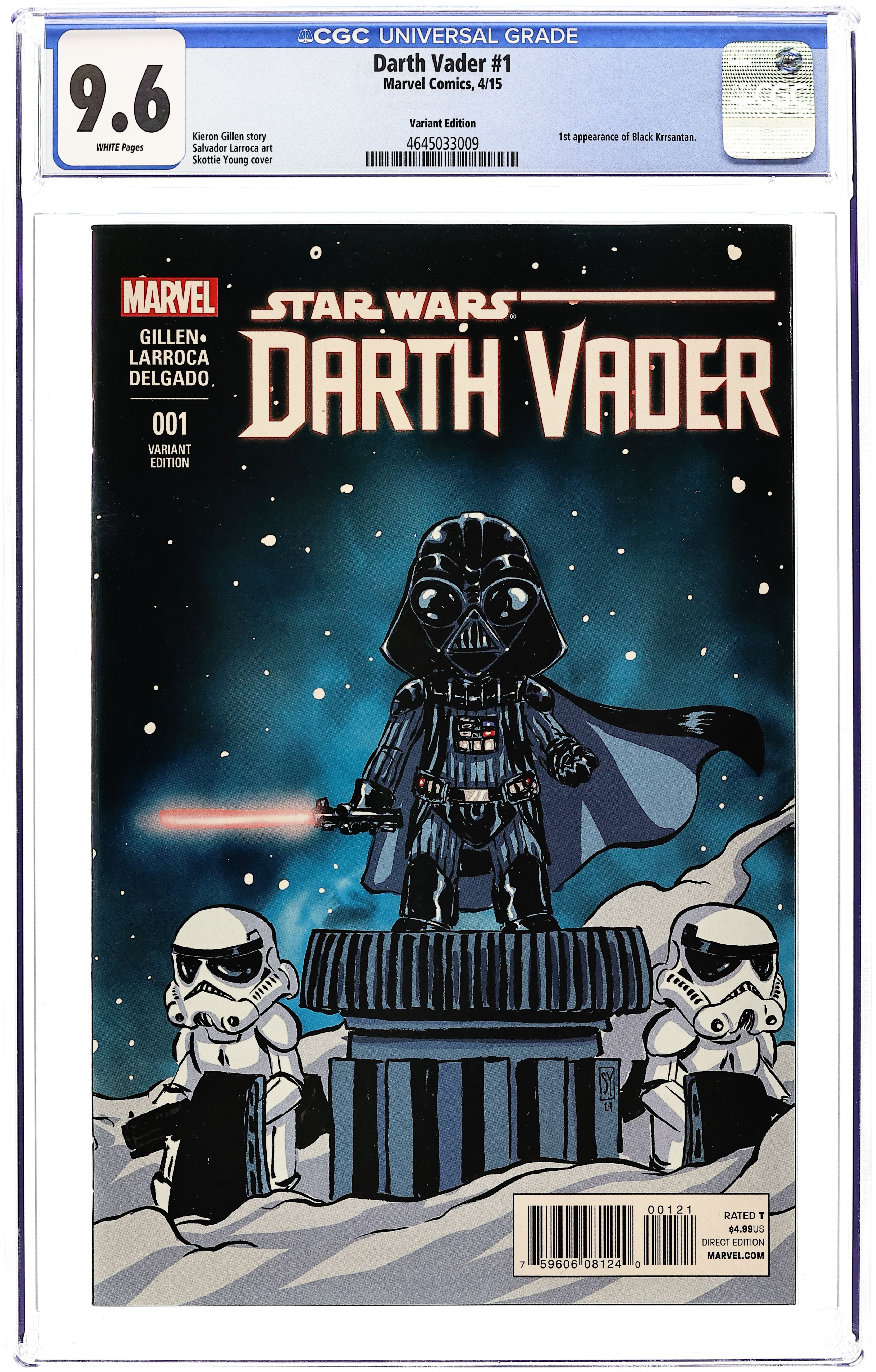 Written by Kieron Gillen. Art by Salvador Larroca. Cover by Skottie Young. The original Dark Lord of the Sith stars in his first ongoing series! Ever since Darth Vader made his first on-screen appearance, he became the one of the most popular villains to ever haunt an audience's dreams! Now, follow Vader straight from the ending of A NEW HOPE (and the pages of the new STAR WARS comic book) into his own series, showing the Empire's war with the Rebel Alliance from the other side! 44 pages, full color. Rated T Cover price $4.99. Grade: CGC 9.6 explanation of grade Condition: Used (collectible)