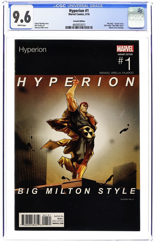 Starts Feb 2 Hip Hop Variant Cover by Shawna Mills. Written by Chuck Wendig. Art by Nicole Virella. HYPERION IS BACK! Or is he? The high-powered hero is hiding in plain sight, driving a truck across the U.S. to learn about the country he has adopted. Along the way, he picks up a lone runaway named Doll, who has more baggage than he anticipated. Doll is in danger, chased by a pack of freaks and lunatics known as THE CARNIES. Will Hyperion reveal himself to save her? Maybe! Will he use a tractor trailer as a baseball bat? Probably! 28 pages, full color. Rated T+ Cover price $3.99. Grade: CGC 9.6 explanation of grade Condition: Used (collectible)