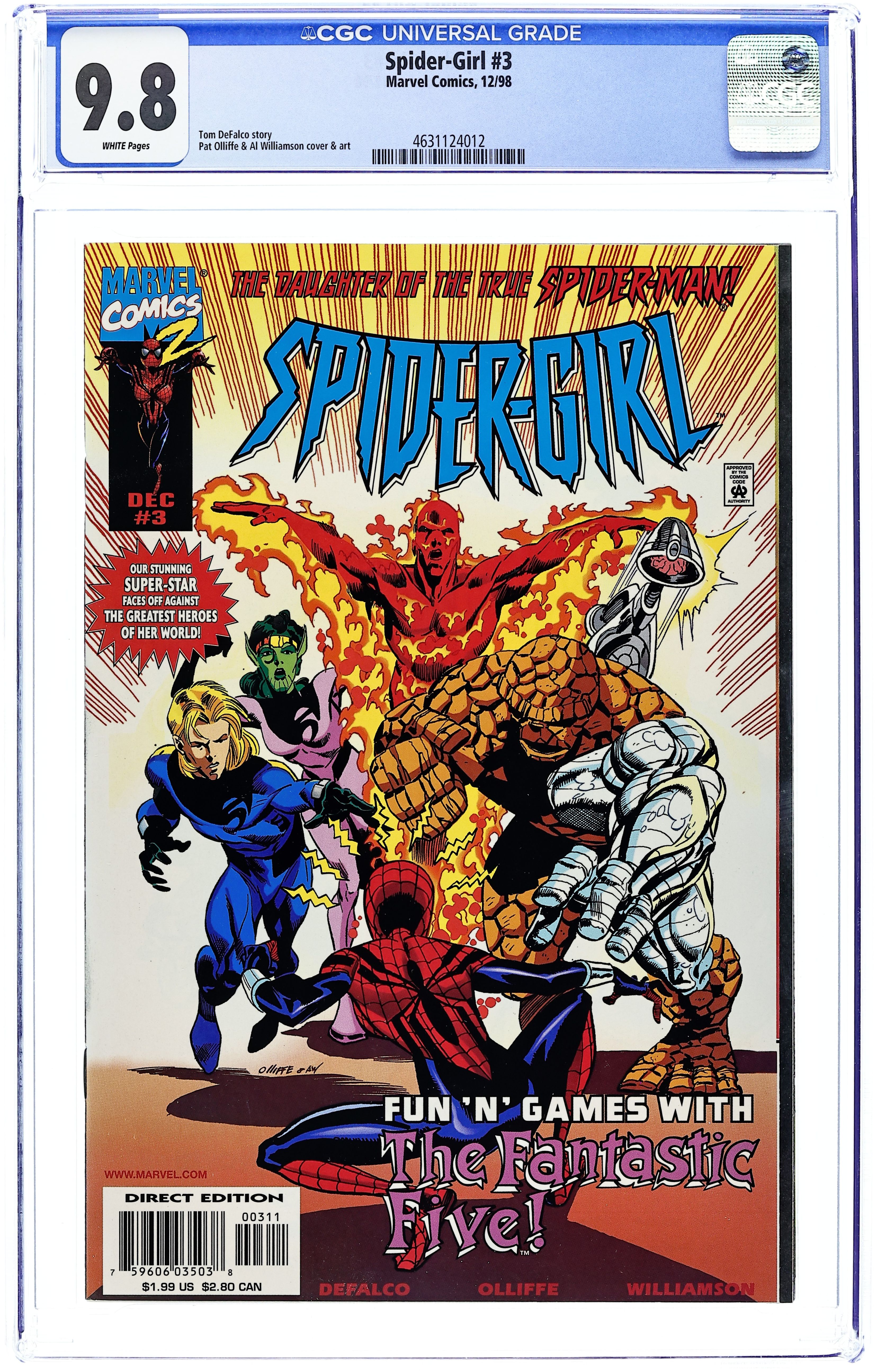 Starts Feb 2 Cover pencils by Pat Olliffe. Fun 'N' Games With the Fantastic Five starring Spider-Girl, script by Tom DeFalco, pencils by Pat Olliffe, inks by Al Williamson; Spider-Girl meets the Fantastic Four while battling Spyral; Phil Urich tells her his past. 38 pgs. $1.99. Cover price $1.99. Grade: CGC 9.8 explanation of grade Condition: Used (collectible)