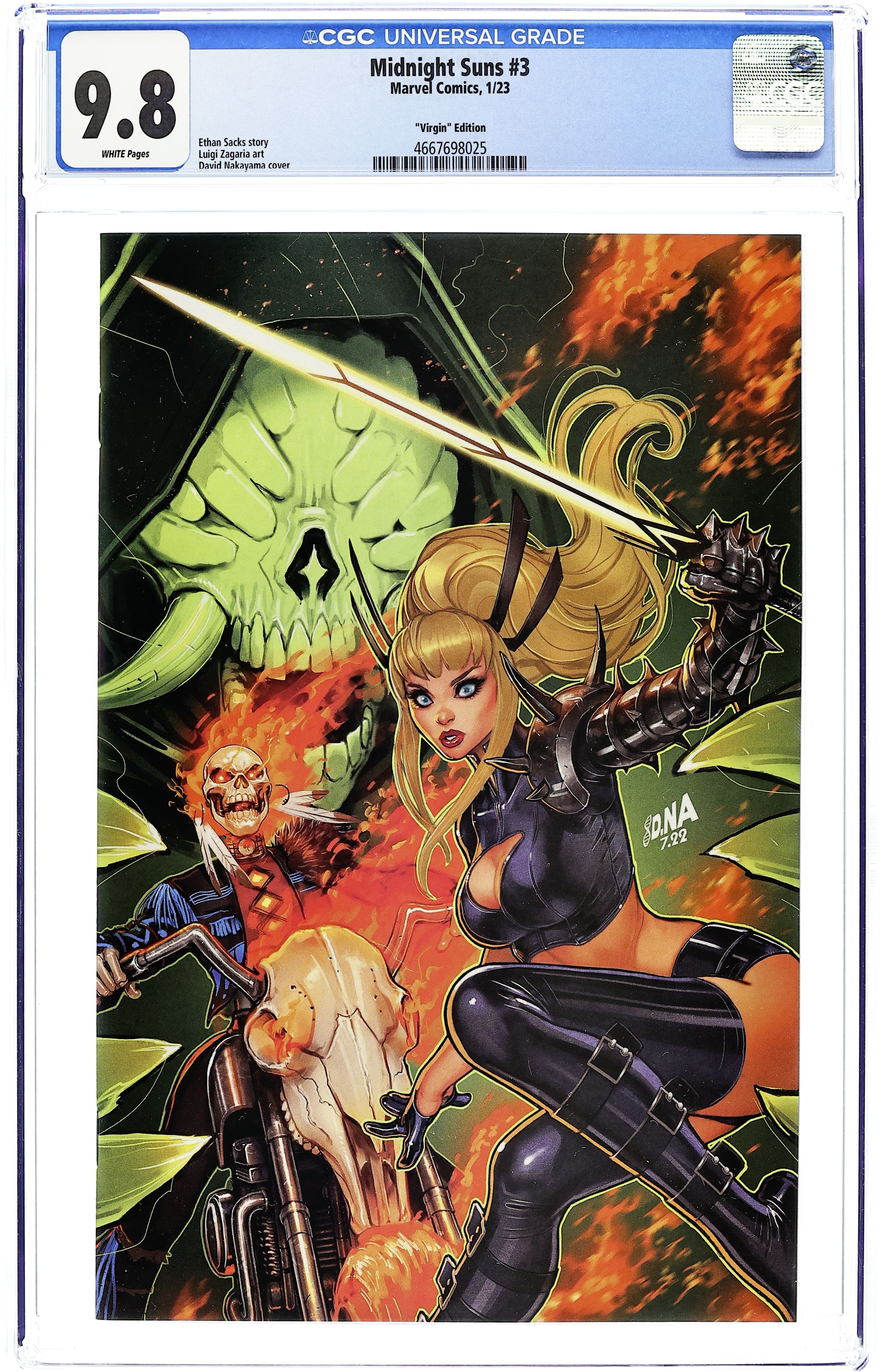 Comics Illuminati (Unknown Comics, Street Level Hero, Comic Traders, Anti-Hero Gallery, and The 616 Comics) Exclusive Virgin Cover by David Nakayama. Written by Ethan Sacks. Art by Luigi Zagaria. Beware the Vapors of Valtorr! The MIDNIGHT SUNS brave the darkest and most horrifying journey imaginable to secure aid from one of the most ancient and dangerous beings in all of existence. What terrible secret from the past is AGATHA HARKNESS hiding? And what does the truth mean for ZOE LAVEAU's future?! 28 pages, full color. Rated Teen Grade: CGC 9.8 explanation of grade Condition: Used (collectible)