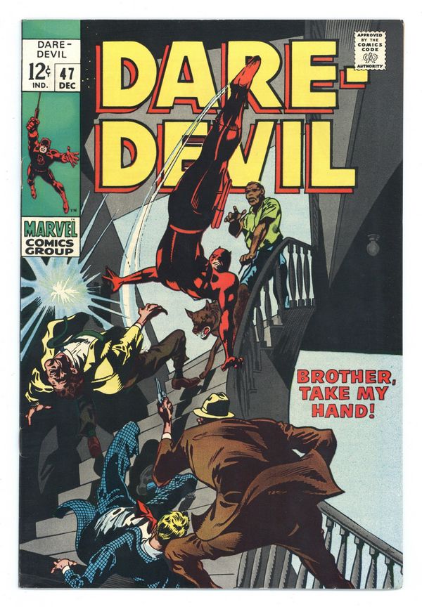 Starts Feb 2 Cover pencils by Gene Colan, inks by George Klein. Brother, Take My Hand!, script by Stan Lee, pencils by Gene Colan, inks by George Klein; Daredevil visits troops in Vietnam and meets soldier named Willie Lincoln, who was blinded while on a tour of duty; Matt and Daredevil protect Lincoln, who was forced to take a bribe, and whose name was cleared by Matt; guest-starring bad guy Biggie Benson. 36 pgs. Cover price $0.12. Cover price $0.12. Grade: VF 8.0 explanation of grade Condition: Used (collectible)