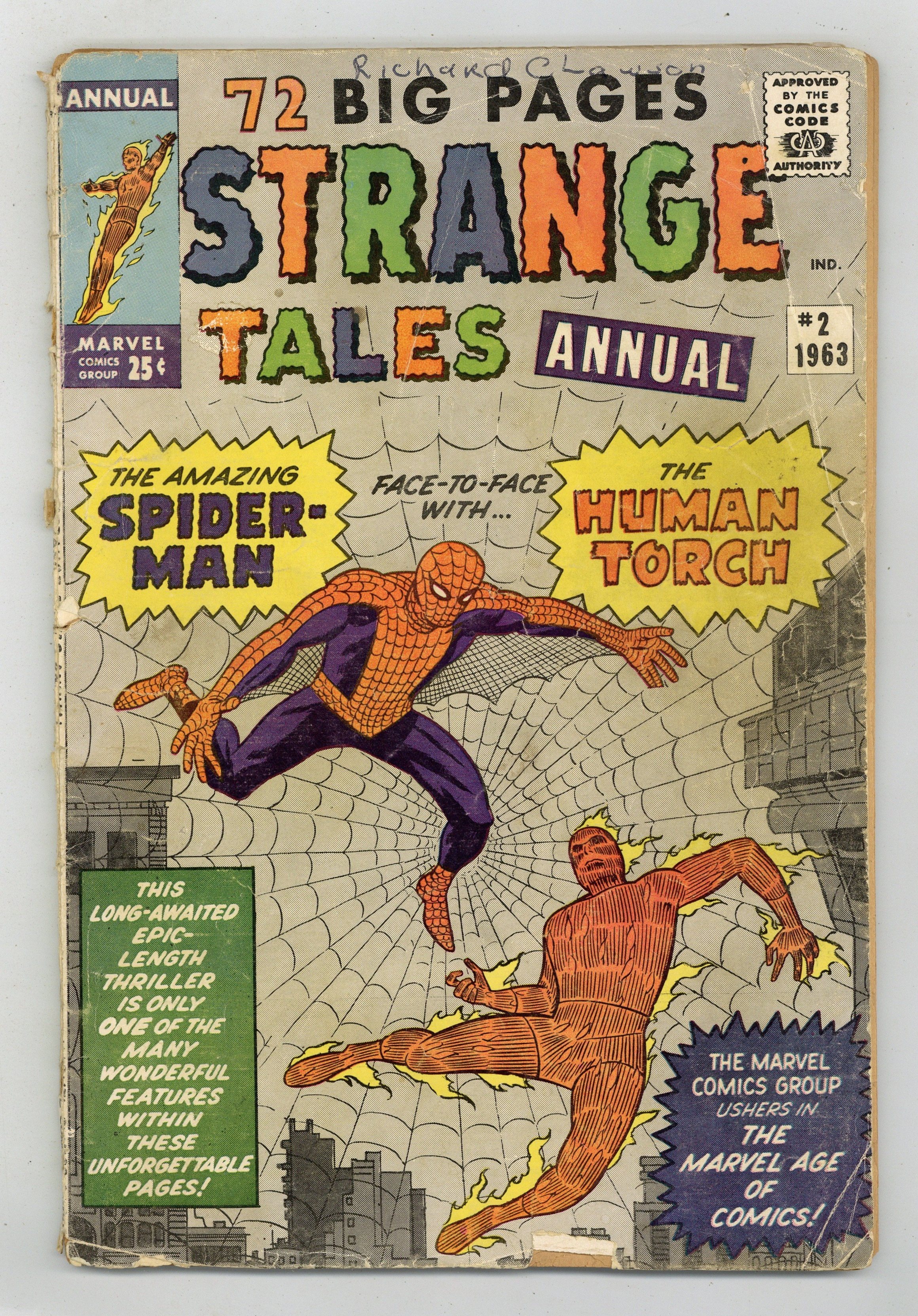 New 18-page Human Torch versus Spider-Man (4th appearance) story , "On the Trail of the Amazing Spider-Man!" Script by Stan Lee, pencils by Jack Kirby, inks by Steve Ditko. Sue Storm appearance. The rest of the issue contains reprints: "I Was the Invisible Man!" Script by Lee, pencils by Kirby, inks perhaps by Paul Reinman (from Strange Tales 67); "I Was a Prisoner on the Planet of Plunder!" Art by Don Heck (from Strange Worlds 2); "I Am Robot!" Art by Joe Sinnott (from SW 1); "Worlds Within Worlds" (from World of Fantasy 16); "I Was the Man Who Lived Twice!" Art by John Buscema (from SW 3); "I Fly to the Stars!" Script by Lee, pencils by Kirby, inks perhaps by Dick Ayers (from SW 3); "Prisoner 2000 A.D." Script by Lee, pencils by Kirby, inks perhaps by Ayers (WOF 16); "I Am the Scourge of Atlantis!" Art by Ayers (from SW 2); "Nightmare Planet!" Art by Sinnott (from WOF 16); and "I Captured the Abominable Snowman!" Script by Lee, art by Ditko (from SW 1). Kirby/Ditko cover. 76 pages, full color. Cover price $0.25. Grade: PR 0.5 explanation of grade Condition: Used (collectible)
