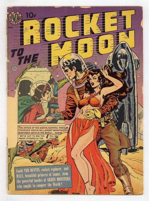 Stories by Walter Gibson and Otis Adelbert Kline. Art by Charles Nicholas and Joe Orlando. Cover by Joe Orlando. A science-fiction tale based on the novel "Maza of the Moon" by Otis Adelbert Kline. An American inventor becomes the first human to land an object on the moon, by firing a giant space-gun at it. To his surprise, the people of the moon fire back. When he visits the satellite, he becomes caught up in the conflict between two warring peoples, one of which is ruled by a beautiful moon-princess. The story was written by Walter Gibson, best known as the author of The Shadows pulp adventures (under the name Maxwell Grant). Also featuring a Flash Harper backup story, and a classic space-opera cover by Joe Orlando. Rocket to the Moon; The Death Doll! 36 pages, full color. Cover price $0.10. Grade: PR 0.5 explanation of grade Condition: Used (collectible)