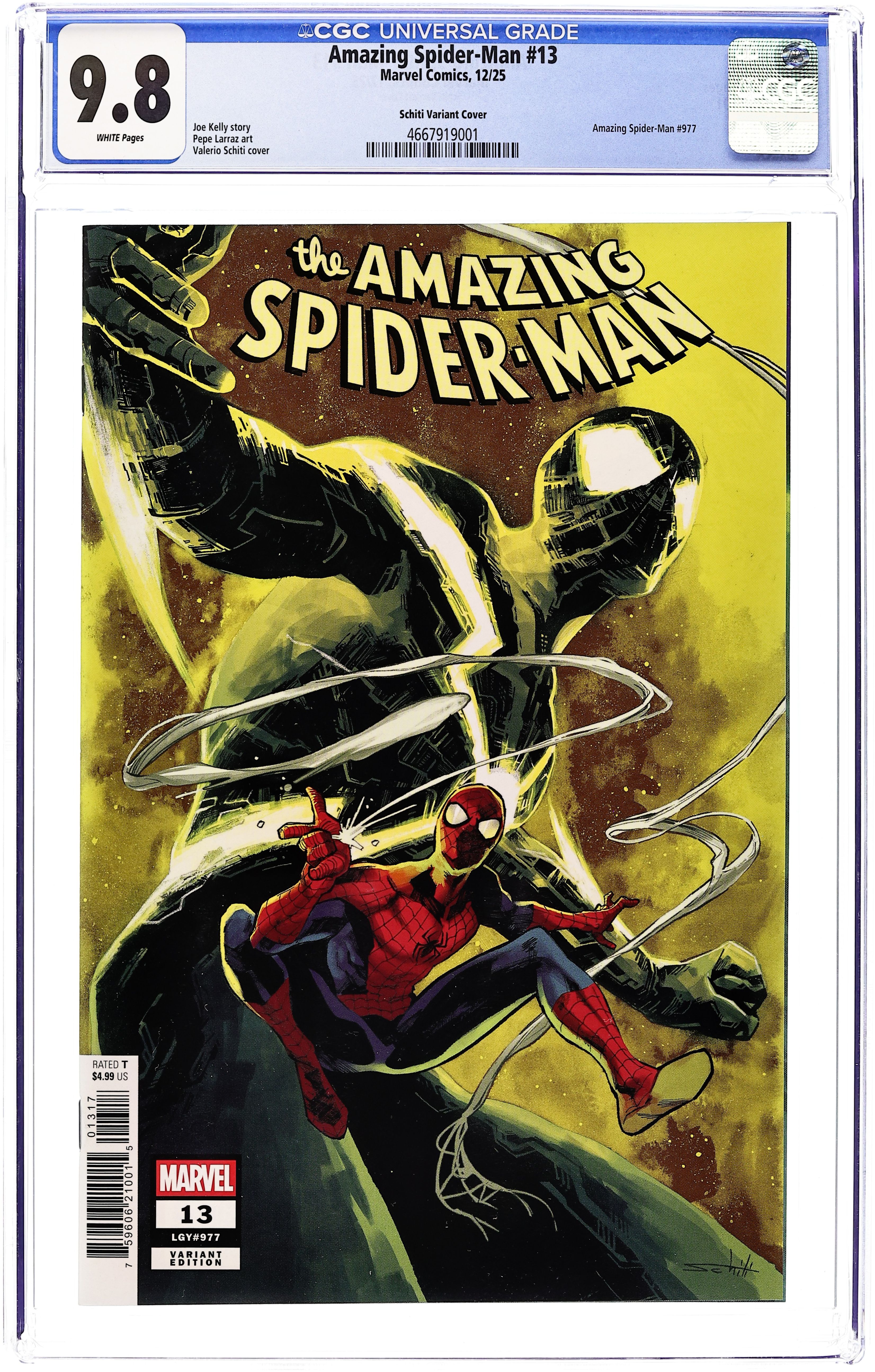 Starts Feb 2 Limited 1 for 25 Retailer Incentive Variant Cover. Written by Joe Kelly. Art by Pepe Larraz. Cover by Valerio Schiti. SPIDEY & HIS COSMIC FRIENDS! Who is this space-faring Spider-Man, and who is his crew?! You may recognize Rocket Raccoon and may have heard of Symbie. The other companions will have a huge impact on Spider-Man and may hold a key to some mysteries that have been brewing! Cover price $4.99. Grade: CGC 9.8 explanation of grade Condition: Used (collectible) unless item is a new release