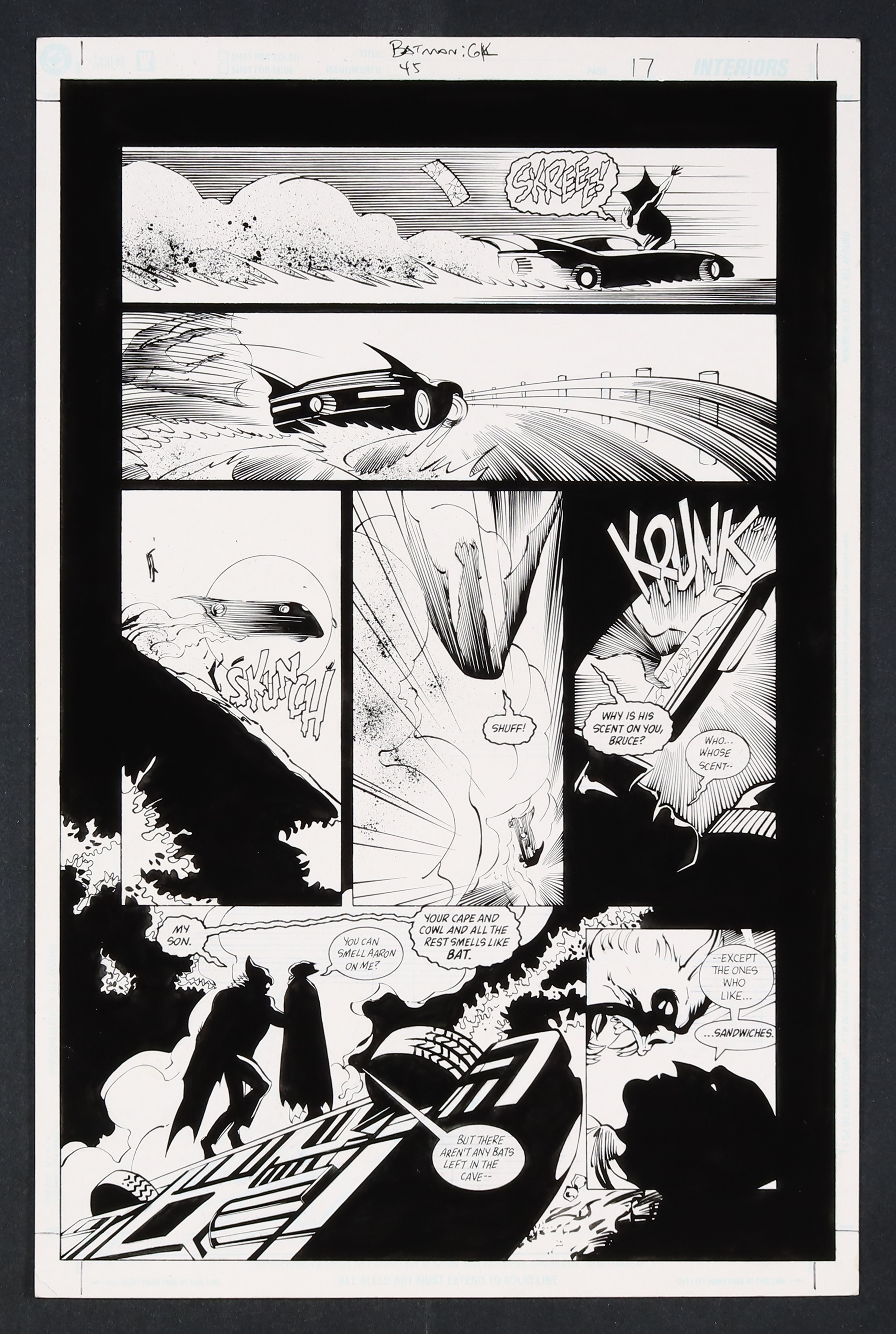 - A nice action page as Batman finds himself in the market for a new car thanks to the surprise appearance of Man-Bat! Searching for his missing son, Man-Bat helps Bruce connect some dots- his suit is covered with Langstrom's son's scent and the sandwiches Alfred leaves out in the cave have begun to go missing. Could there be an extra bat in the Batcave? Pencil and ink on DC Comics art board. 11" X 17".
