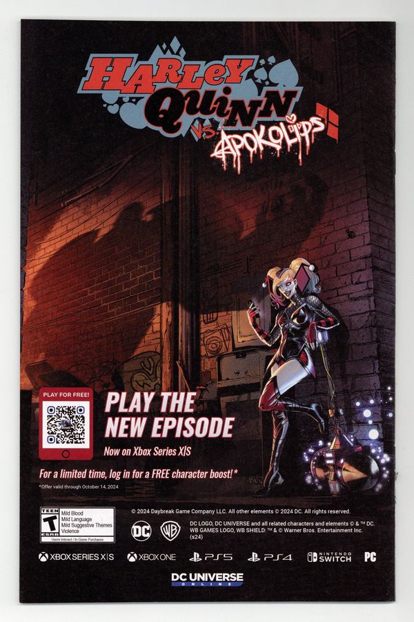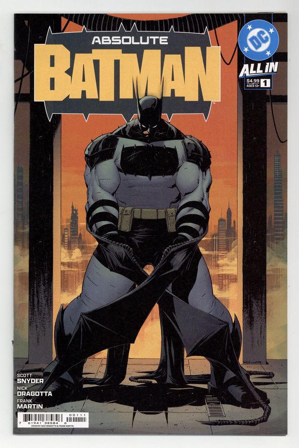 Starts Feb 9 Written by Scott Snyder. Art by Nick Dragotta. Cover by Nick Dragotta. BATMAN LEGEND SCOTT SNYDER AND ICONIC ARTIST NICK DRAGOTTA TRANSFORM THE DARK KNIGHT'S TALE FOR THE MODERN AGE! Without the mansion...without the money...without the butler...what's left is the Absolute Dark Knight! 44 pages, full color. Rated T+ Cover price $4.99. Grade: FN+ 6.5 explanation of grade Condition: Used (collectible)