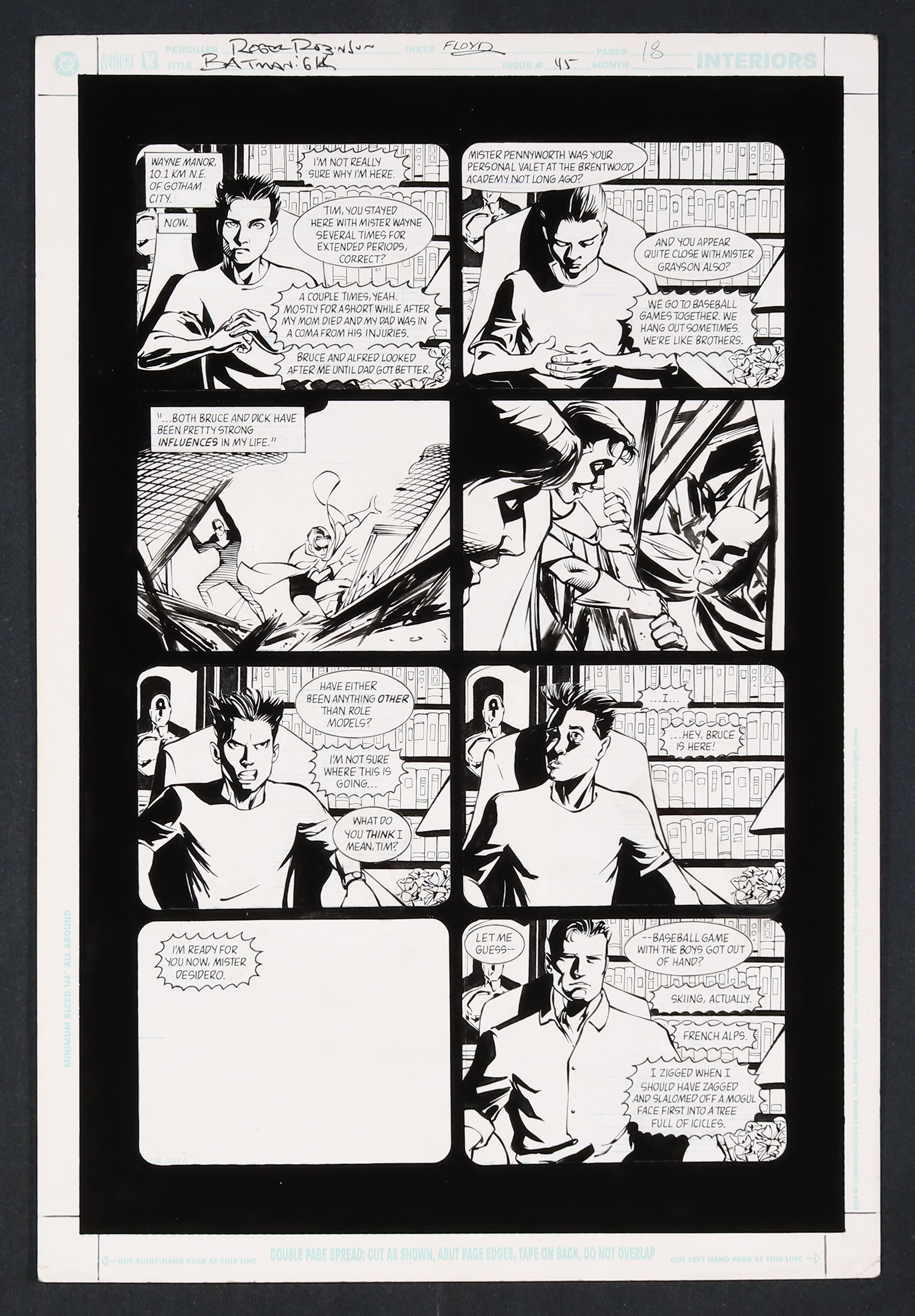 - Tensions are high at Wayne Manor as a social services investigator has been looking into the death of Jason Todd, necessitating interviews with Bruce's other wards. Here, it's Tim Drake's turn and just as the (then) youngest Robin begins to lose his cool, Bruce unexpectedly arrives cool as ever in the face of the increasingly aggressive questioning. Pencil and ink on DC Comics art board. 11 1/2" X 17".