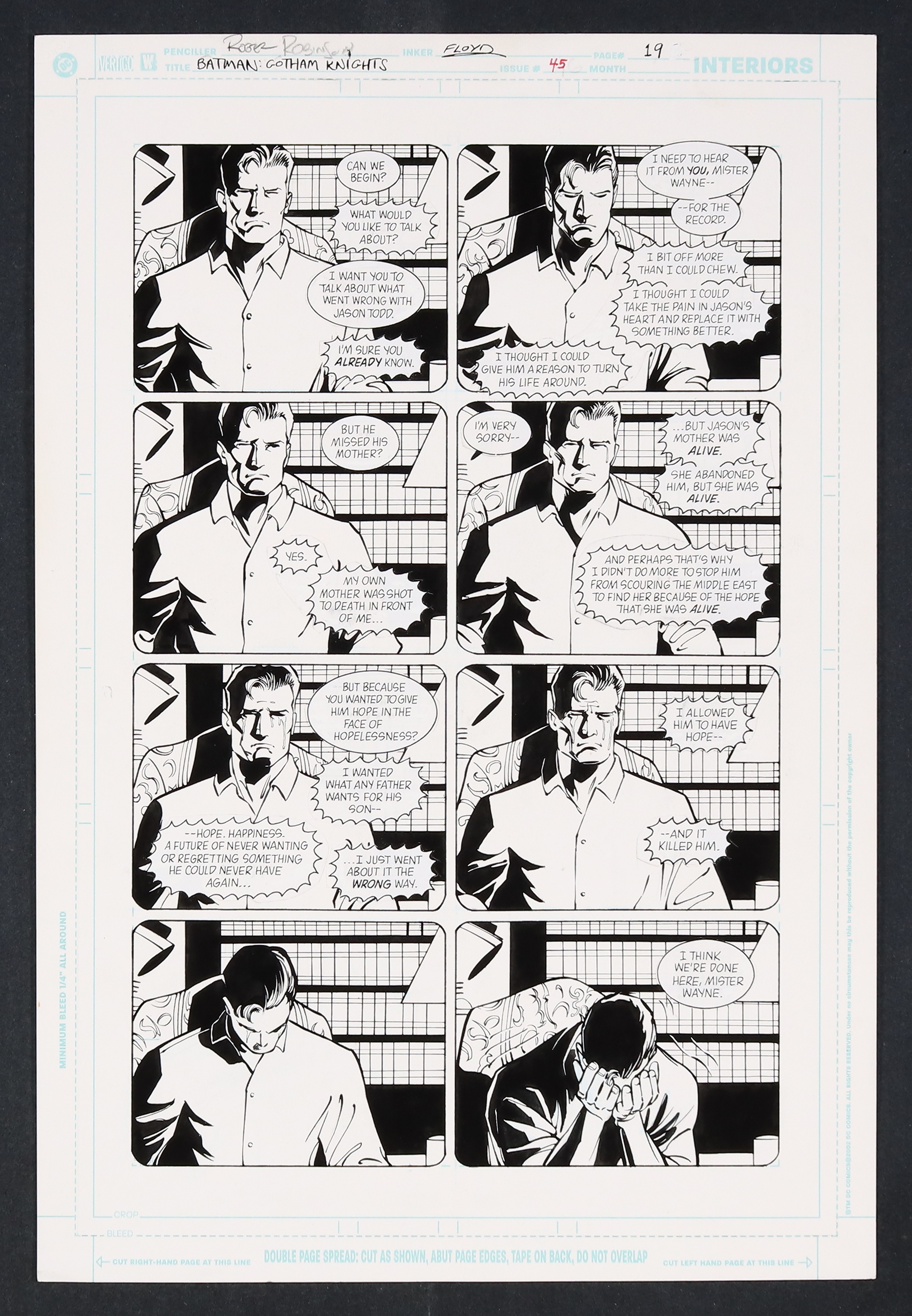 - In a very emotional scene we see Bruce Wayne begin to break down as he recounts his failings that led to the death of Jason Todd to a social services investigator who's taken an interest in the case. Robinson and Floyd do a great job of capturing the emotional weight of this scene as Bruce doesn't tell any of the usual playboy billionaire cover up stories but instead opens up and gives his honest view on his greatest failure in an eight panel, slow motion breakdown. Pencil and ink on DC Comics art board. 11 1/2" X 17".