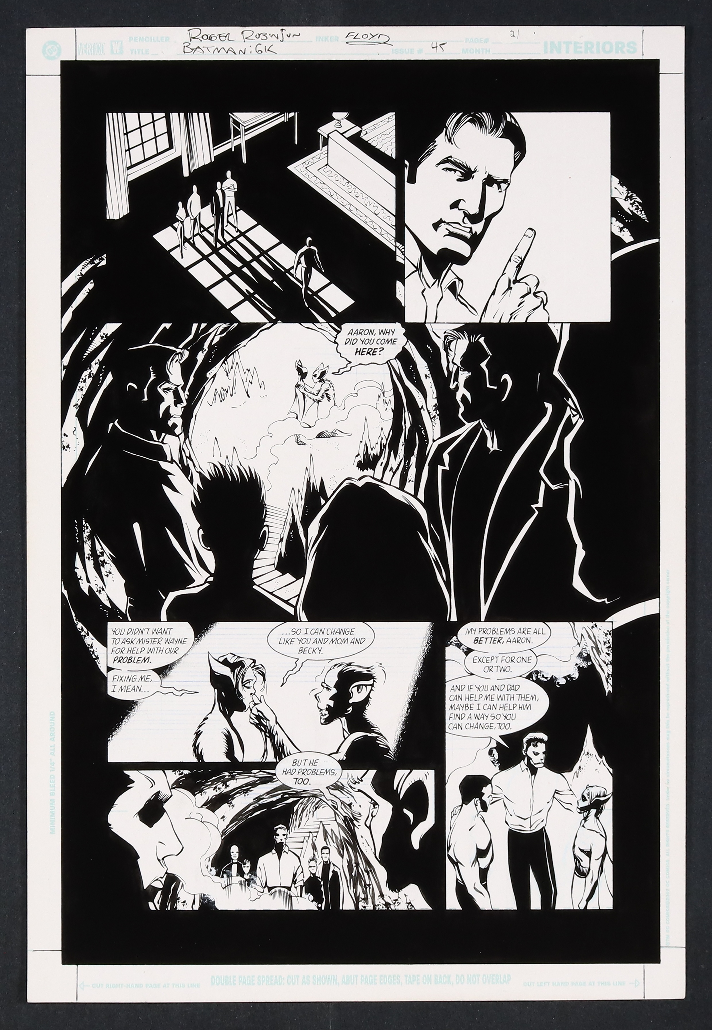 - Father and son are reunited as Kirk Langstom (Man-Bat) and his son Aaron talk in the Batcave about why he ran away. It's happy families all around as the now-cleared-of-suspicion-in-the-death-of-Jason-Todd Batfam joins them. Pencil and ink on DC Comics art board. 11 1/2" X 17". NOTE: This page was edited for publication with the first two panels removed and the rest of the page shifted up to accommodate the addition of three panels from the next page, which was also edited in a similar manner.