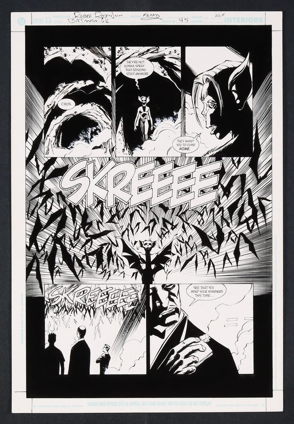 - A happy ending! With Bruce Wayne no longer being investigated in the death of Jason Todd and Kirk Langstrom reunited with his son Aaron, it's time for a celebration as Aaron returns the bats to the Batcave (they were chased out when Alfred was quarantined in the cave with a variant of the Clench). It is a joyous reunion capped off with the delightful touch of Alfred getting a big glob of guano right on his shoulder. Pencil and ink on DC Comics art board. 11 1/2" x 17". NOTE: This page was edited for publication with the top three panels being moved to the previous page and two panels from the next page added in at the bottom here.