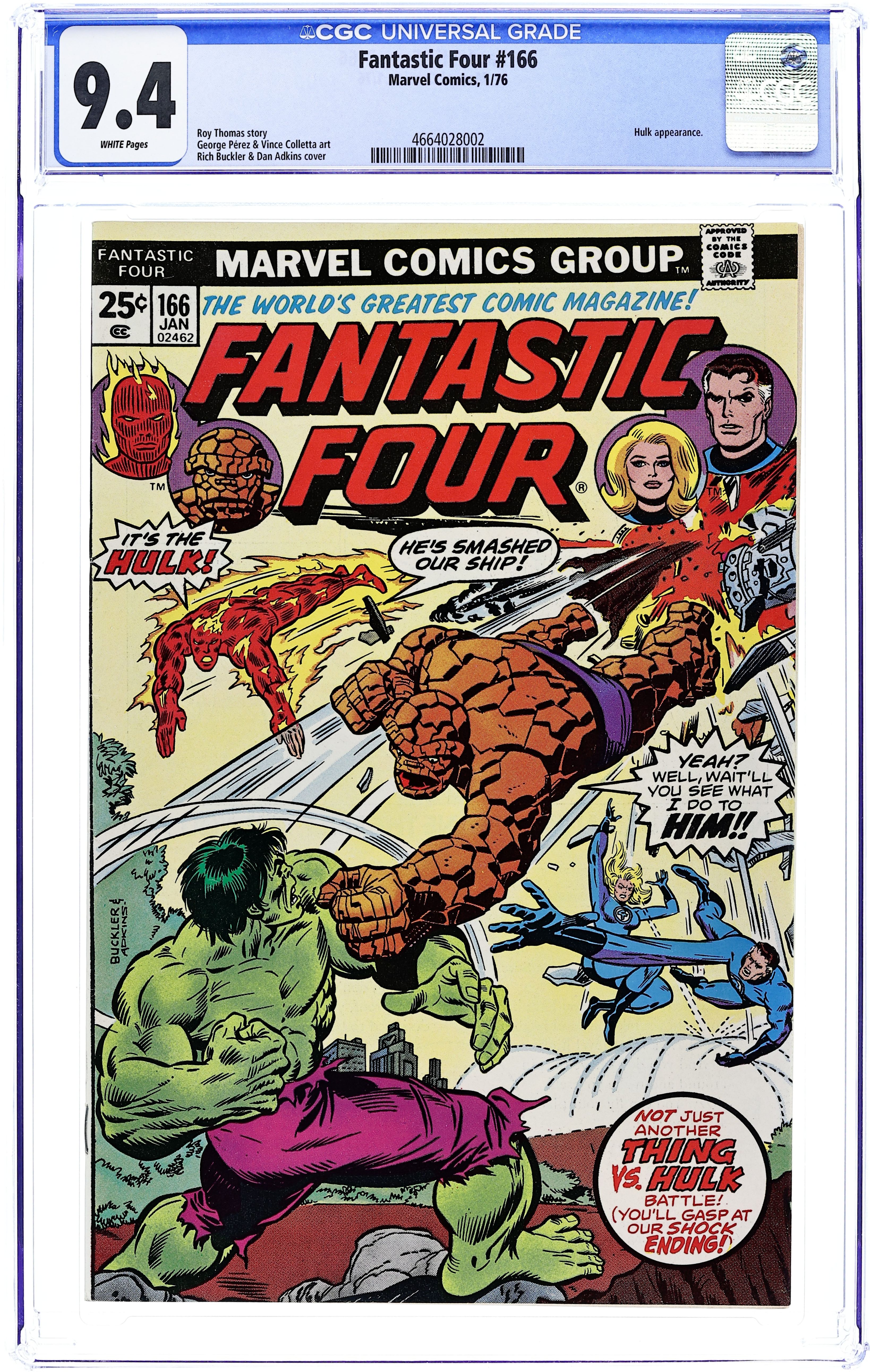 "If It's Tuesday, This Must Be The Hulk!" Part 1 of 2. Guest-starring the Hulk. Script by Roy Thomas. Pencils by George Perez. Inks by Vince Colletta. Cover by Rich Buckler and Dan Adkins. The federal government asks Reed Richards to take the Fantastic Four to the Midwest to apprehend the Hulk! Will the FF be able to find the Green Goliath? Yes! And that's were the trouble begins! However, the fabulous foursome successfully captures the Hulk and hands the behemoth over to the military. It looks like mission accomplished for the FF...until the Thing becomes dismayed over the rough treatment of Dr. Banner. Would Ben actually consider freeing the rampaging Hulk? Yes again! (Note: The letters page contains Marvel Value Stamp series B #13 Doctor Strange by Frank Brunner.) 36 pages Cover price $0.25. Grade: CGC 9.4 explanation of grade Condition: Used (collectible)