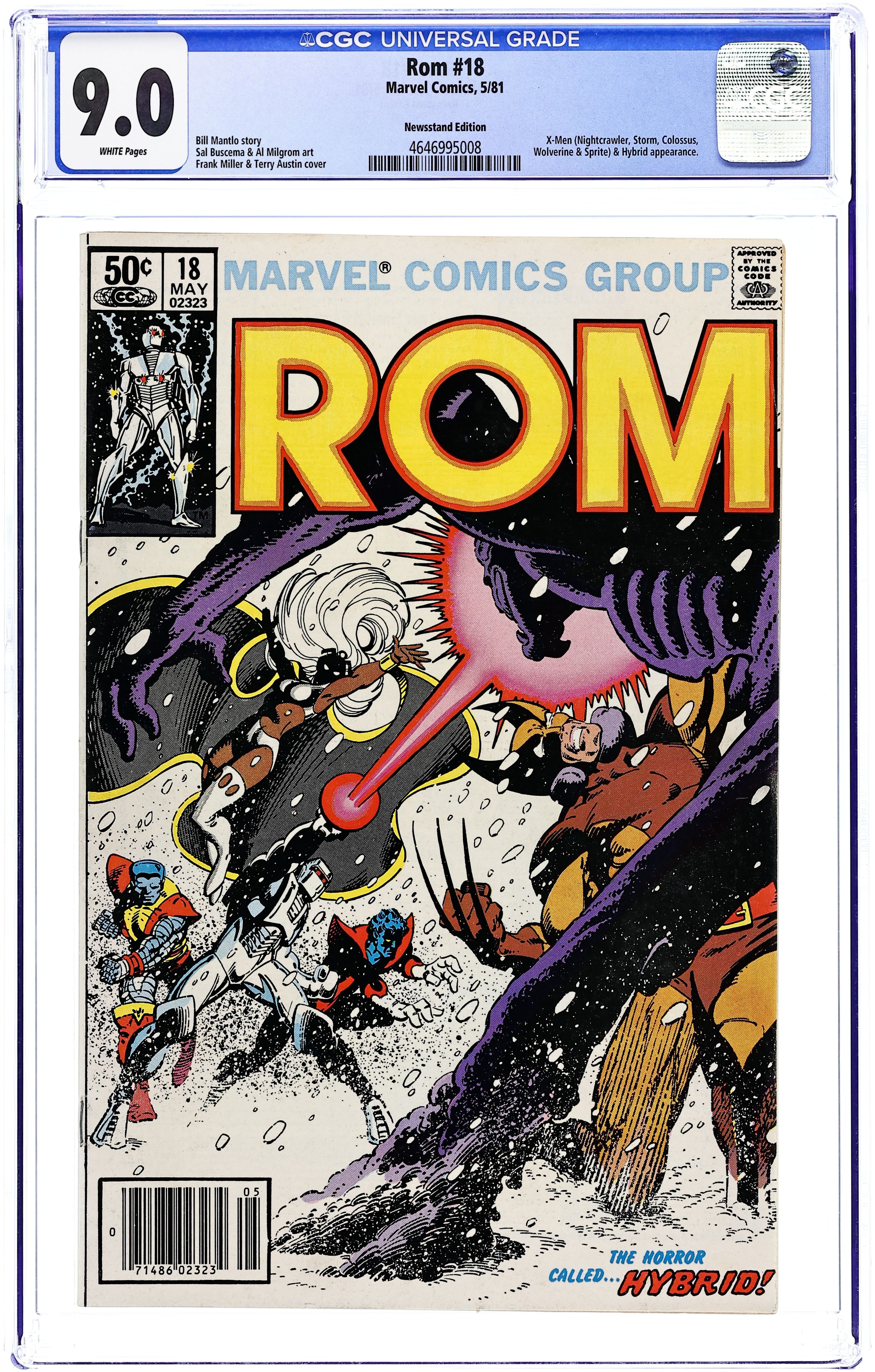 Newsstand Edition. Part 2 of 2 - Guest starring the Uncanny X-Men (Wolverine, Storm, Nightcrawler, Colossus, and Sprite). Story by Bill Mantlo. Art by Sal Buscema. Frank Miller cover. Born from the unnatural union of a Dire Wraith father and a human mother, the malevolent Hybrid has used his powerful psionic and shape-changing abilities to trick the X-Men into thinking that Rom is the evil one. Now, Rom must stave off the powerful mutants long enough to convince them of the true threat before it is too late. 32 pages. NOTE: 2nd appearance of Hybrid. Cover price $0.50. Grade: CGC 9.0 explanation of grade Condition: Used (collectible)