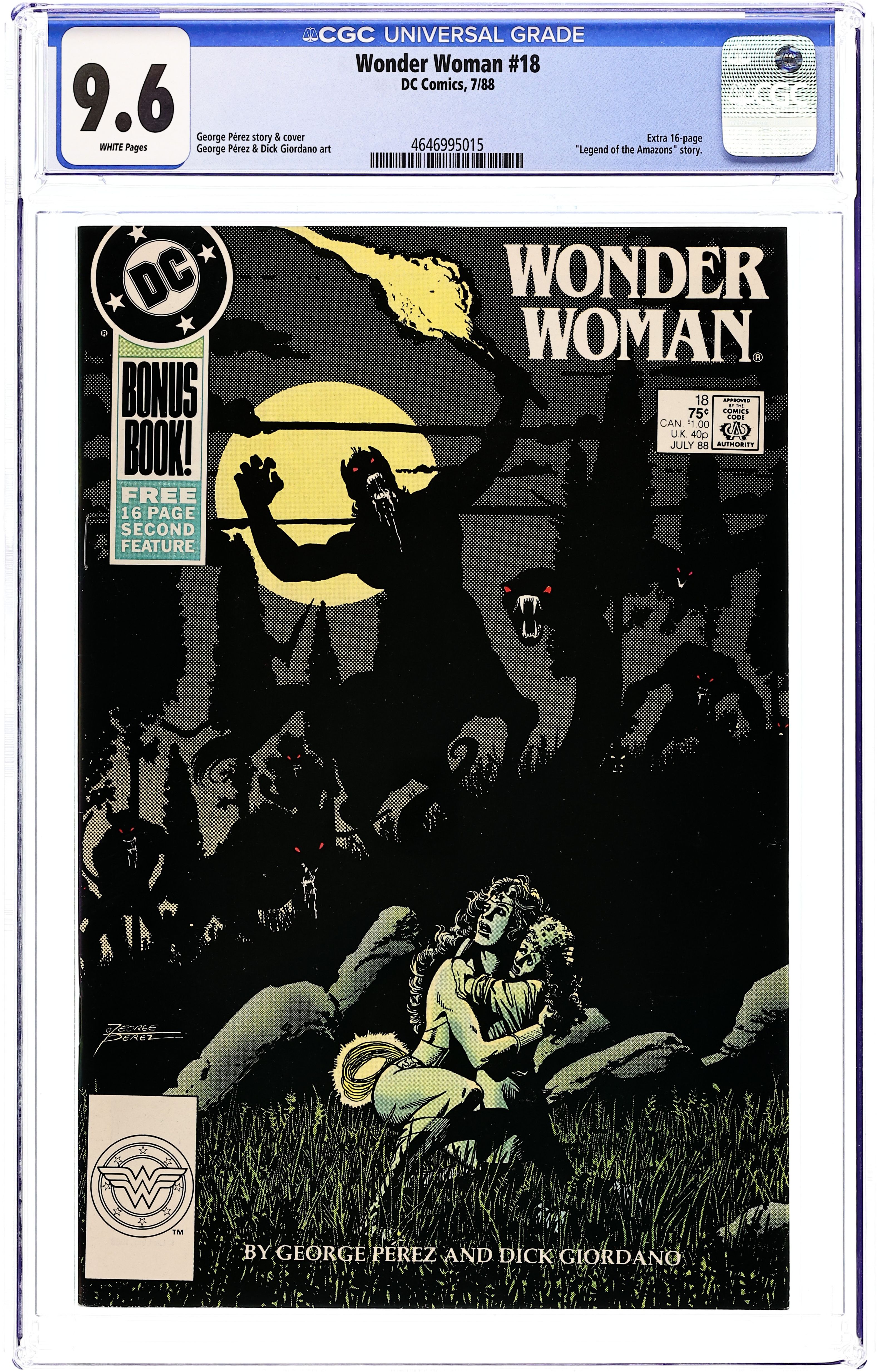 Starts Jan 19 At the behest of their mistress, the mysterious creatures of the night ambush Diana in "Creatures of the Dark". Part 2 of 3, continued from the previous issue. Story concludes next issue. Script and pencils by George Perez, finishes by Dick Giordano. Bonus 16-page insert book: "Legend of the Amazons: Awakenings" by Dan Littleford, Palmer Worley and Brian Thomas. Perez cover. 52 pgs. Cover price $0.75. Grade: CGC 9.6 explanation of grade Condition: Used (collectible)