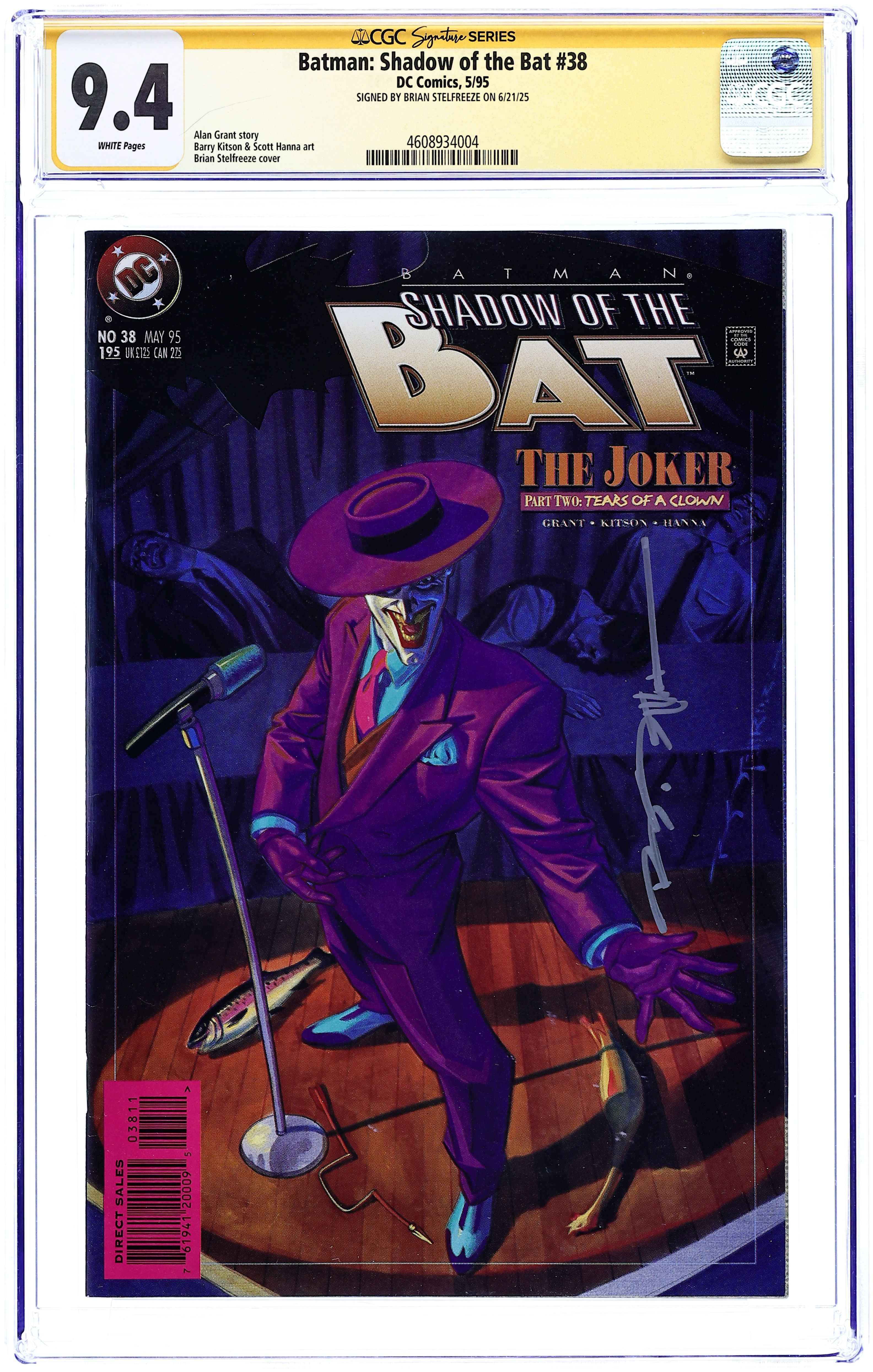 In "The Joker Part Two: Tears of a Clown," concluding the tale begun last issue, the Joker has made several people laugh themselves to death in a deserted mansion, while Batman and the mysterious Wild converge on the Clown Prince of Crime. Written by Alan Grant, with art by Barry Kitson and Scott Hanna. Painted cover by Brian Stelfreeze. New Format. Cover price $1.95. Grade: CGC 9.4 explanation of grade Condition: Used (collectible)