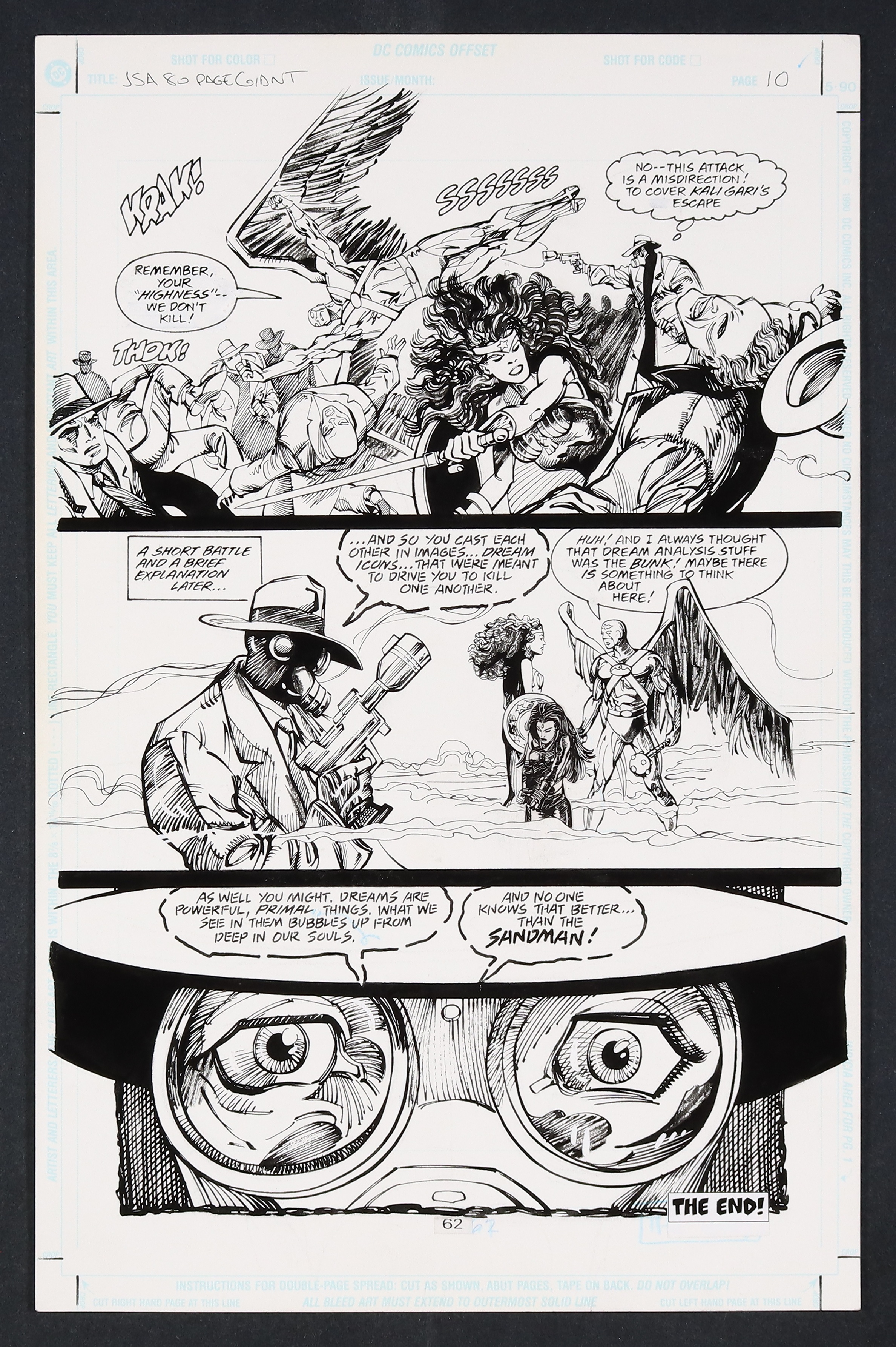 - As the battle ensues Sandman realizes this is all a distraction for Kali Gari Nazi Dream Assassin to make her escape. With everything sorted out, Sandman takes a moment to wax poetic about the world of dreams and a beautifully drawn closeup panel that closes the story. Pencil and ink on DC Comics Art board. 11" X 17". NOTE: The Kali Gari figure in panel two is a pasted-in printed stat.