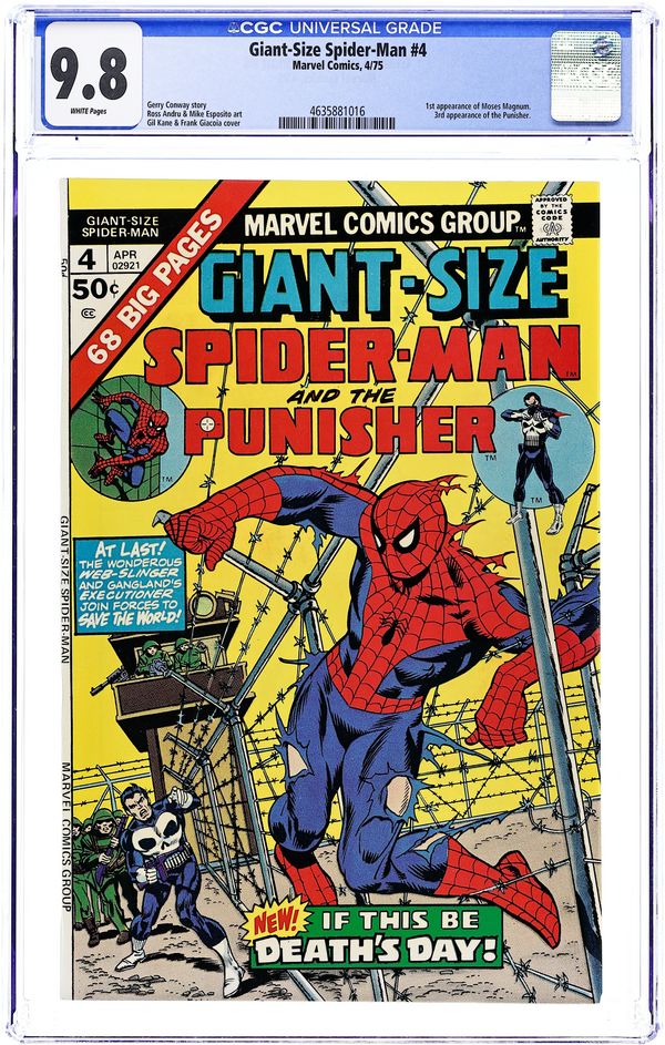 3rd appearance of the Punisher in "To Sow the Seeds of Death's Day!" Script by Gerry Conway. Pencils by Ross Andru. Inks by Mike Esposito. Cover by Gil Kane and Mike Esposito. The Punisher has discovered that an evil mastermind is testing biological weapons on kidnapped Americans somewhere in South America. After recruiting the web-slinger to help him, the Punisher and Spider-Man break into the offices of the shadowy Deterrence Research Corporation in New York City. However during the attack, the wall-crawler is captured and transported to the death camp of Moses Magnum! Can the Punisher rescue the Amazing Spider-Man and the captive civilians before they meet a horrible fate? First appearance of Moses Magnum. (Note: The Punisher appears next in Marvel Preview Magazine 2.) Back up story: "The Wondrous World of Doctor Strange!" Script by Stan Lee. Art by Steve Ditko. Spider-Man and the Master of the Mystic Arts team up to battle Xandu! Reprinted from Doctor Strange 179. (Notes: The story originally appeared in Amazing Spiderman Annual 2, and was later reprinted in Doctor Strange 179. A reprint of the cover of Doctor Strange 179 is included in the issue.) 64 pages Cover price $0.50. Grade: CGC 9.8 explanation of grade Condition: Used (collectible)