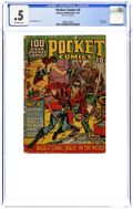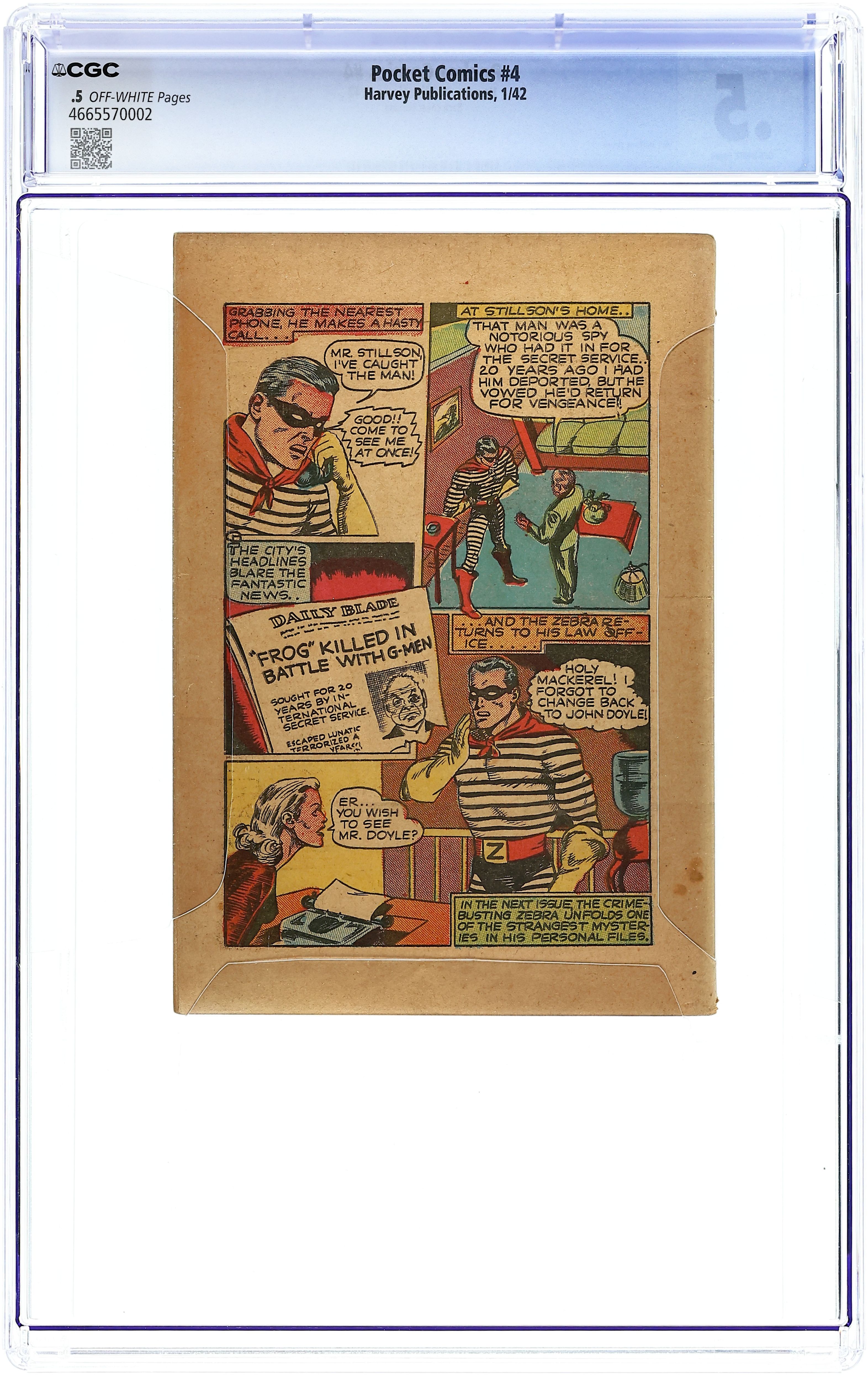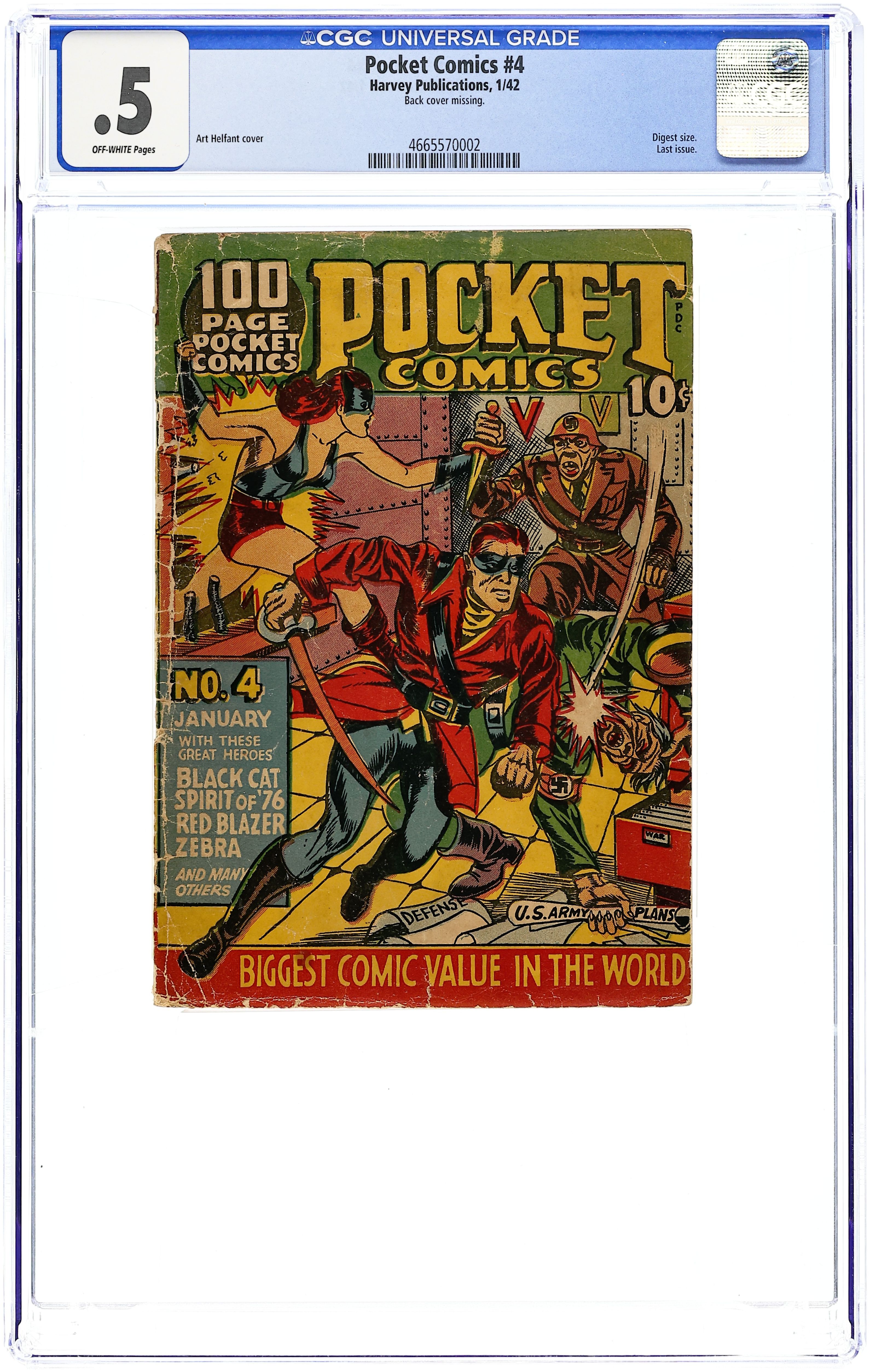 Stories and art by Charles Sultan, Al Weine, Bob Powell, Pierce Rice, Al Avison, Art Helfant, Al Gabriele, Louis Cazeneuve, Barbara Hall, Alfred Harvey and A. W. Nugent. Harvey's first series paved the way for future digest-sized comics, and featured early female superhero Black Cat among other adventurers. The Black Cat joins forces with fellow superhero Spirit of 76 take on a pair of Nazi spies. Spirit of '76 defends America against Nazi infiltrators in the early days of WWII. Ditto swipes a watermelon and meets his instant karma. Cover may be the work of comics legend Joe Simon. Black Cat; Spirit of 76; Private Pinky; Satan Meets His Equal; Spin Hawkins; Simpy; Captain Freedom and the Stratobomber Riddle; Red Blazer; British Agent 99; Can You Solve These Puzzlers?; Phantom Sphinx; Black Cat & Spirit of '76: U.S.A.; Zebra Battles the Human Frog. Final issue of the series. 5-in. x 8-in., 100 pages, Full Color. Cover price $0.10. Grade: CGC 0.5 explanation of grade Condition: Used (collectible)