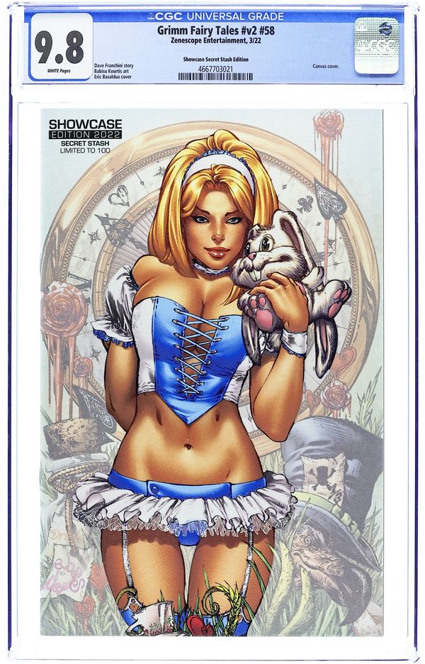 2022 Showcase Edition "Secret Stash" Variant Cover by Eric Basaldua - Limited to 100 copies. Written by Dave Franchini. Art by Babisu Kourtis. Skye Mathers, along with Julia, the Queen of Hearts, has been making her way back to her home world, one universal leap at a time. But her journey has just taken a seriously wrong turn, separating her from her partner. And these new surroundings Skye finds herself in could signal dire consequences for the future she is hurtling toward. What horrible truths lie in this place? Who is the Keeper? And where is Julia? Don't miss this all new chapter in Skye's adventure, sure to answer many questions and create some new ones, as well! 32 pages, full color. Rated T Grade: CGC 9.8 explanation of grade Condition: Used (collectible)