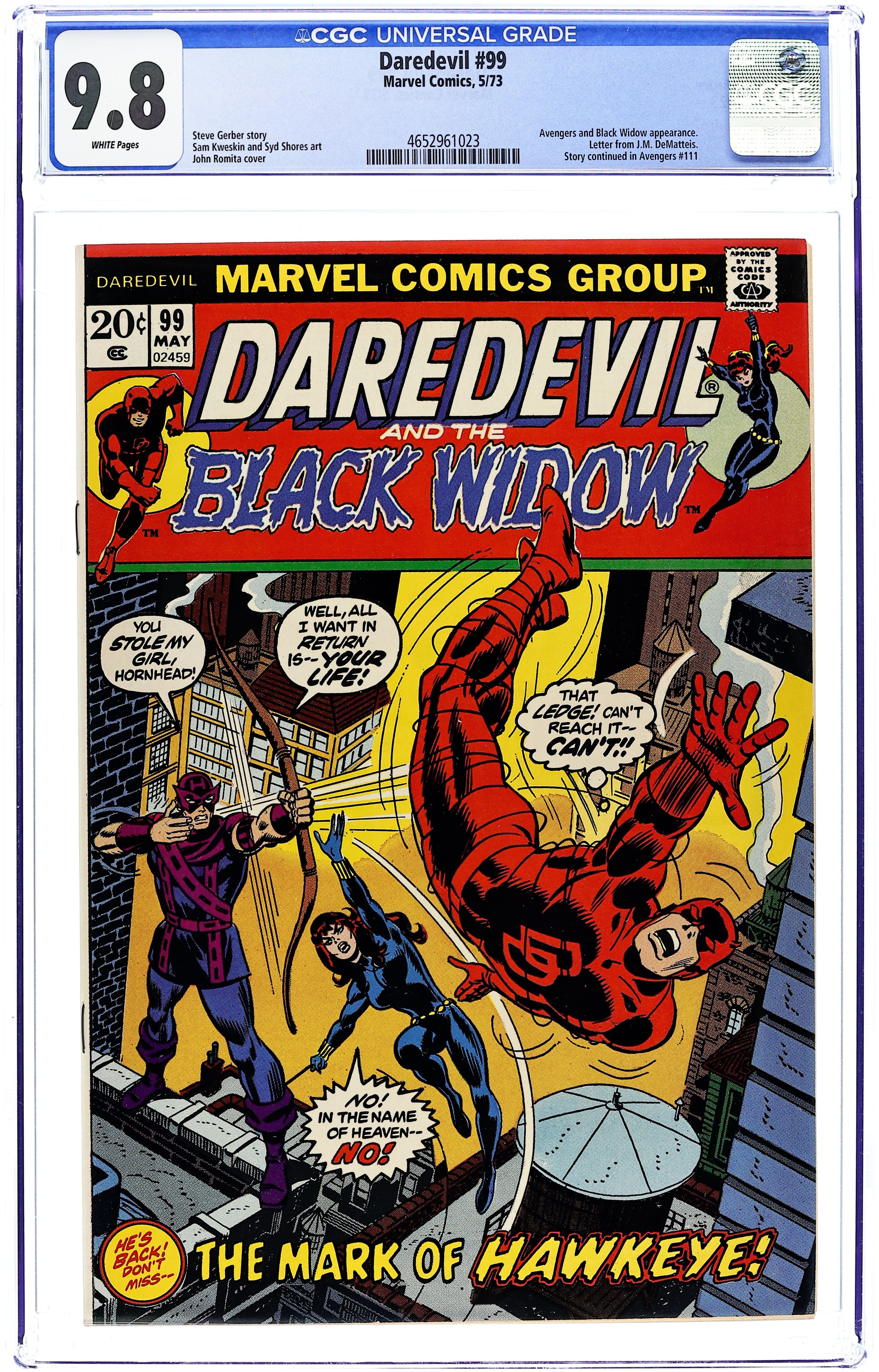 Cover pencils by John Romita Sr., inks by John Verpoorten. The Mark of Hawkeye! Part 2 of 3, script by Steve Gerber, art by Sam Kweskin (designs) and Syd Shores (embellishes); After the battle against the Dark Messiah last issue, the Black Widow and an exhausted Daredevil return home; The duo is just looking for some rest and relaxation, but instead they find Hawkeye the Marksman waiting on the doorstep!; Is Clint Barton trying to rekindle an old flame with Natasha?; Yes, he is!; And it doesn't take long for the ace archer and the Man Without Fear to come to blows!; Not once, but twice!; Meanwhile across the country at Avengers Mansion, Earth's Mightiest Heroes are reeling after being defeated by Magneto; The team is down to just three members and decides to travel west to find help!; The Black Panther, Vision, and Thor plead with their former teammate to rejoin them, but Hawkeye declines; Would Daredevil and the Black Widow be willing to join the fight against the Master of Magnetism?; guest-starring Hawkeye and the Avengers; cameo appearances by Lt. Paul Carson and Ivan Petrovitch. Story continues from Avengers 110 (part 1). Story continues in Avengers 111 (part 3). Letter to the editor from comics writer J.M. DeMatteis. 36 pages. Cover price $0.20. Cover price $0.20. Grade: CGC 9.8 explanation of grade Condition: Used (collectible)