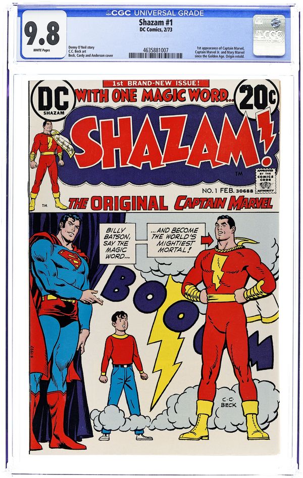 Cover by C. C. Beck, Nick Cardy, and Murphy Anderson. ...In the Beginning ..., script by Denny O'Neil, art by C. C. Beck; After missing for 20 years, Captain Marvel returns to Earth; Origin retold. The World's Wickedest Plan, script by Denny O'Neil, art by C. C. Beck; Captain Marvel escapes the trap that Dr. Sivana had created that caused the Marvel Family to be placed in suspended animation for the last 20 years. Reprint back-up: "The Endless String" (from Captain Marvel Adventures 55 in 1946), written by Otto Binder, art by Pete Costanza. One-page text feature by E. Nelson Bridwell--a history of Captain Marvel. 36 pgs., full color. $0.20. Cover price $0.20. Grade: CGC 9.8 explanation of grade Condition: Used (collectible)