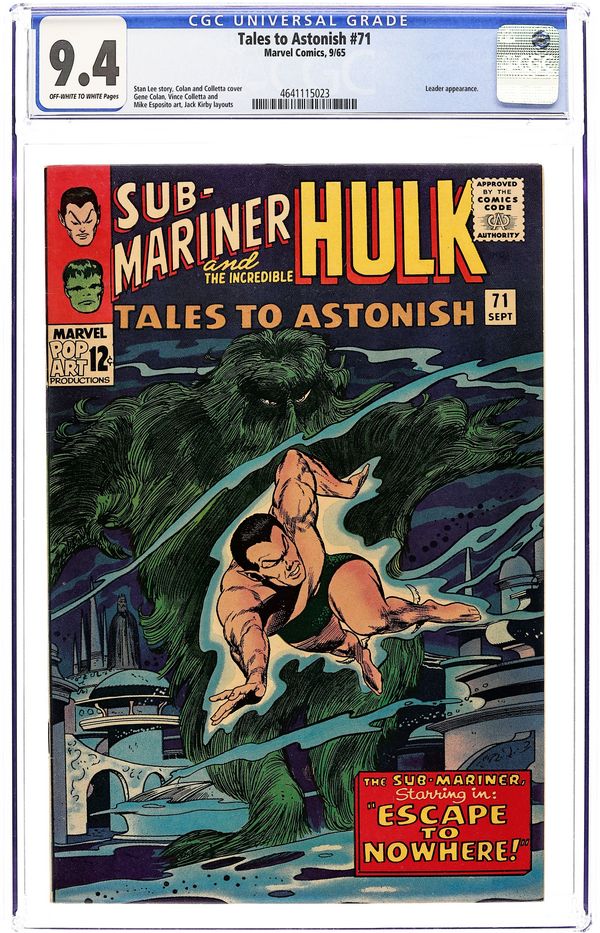 Cover by Gene Colan and Vince Colletta. Escape...to Nowhere!, script by Stan Lee, art by Gene Colan (as Adam Austin) and Vince Colletta; Namor heads into the Forbidden Deeps as he continues his quest for Neptune's Trident; Krang sends Seaweed Man to stop him; Meanwhile, back in Atlantis, the natives are beginning to get restless under Krang's iron rule. Like a Beast at Bay!, script by Stan Lee, art by Jack Kirby and Mike Esposito; The Hulk and Rick barely make it out of the blast radius as Ross fires the giant "Sunday Punch" missile at the Leader's giant Humanoid bringing the massive robot down; The pair decide to hide in their underground cave but are spotted by military planes as they enter; Ross and Talbot attack, threatening the underground complex and Bruce's gamma machine; The Hulk pushes Rick out to safety just as the Leader appears. 36 pgs., full color. $0.12. Cover price $0.12. Grade: CGC 9.4 explanation of grade Condition: Used (collectible)