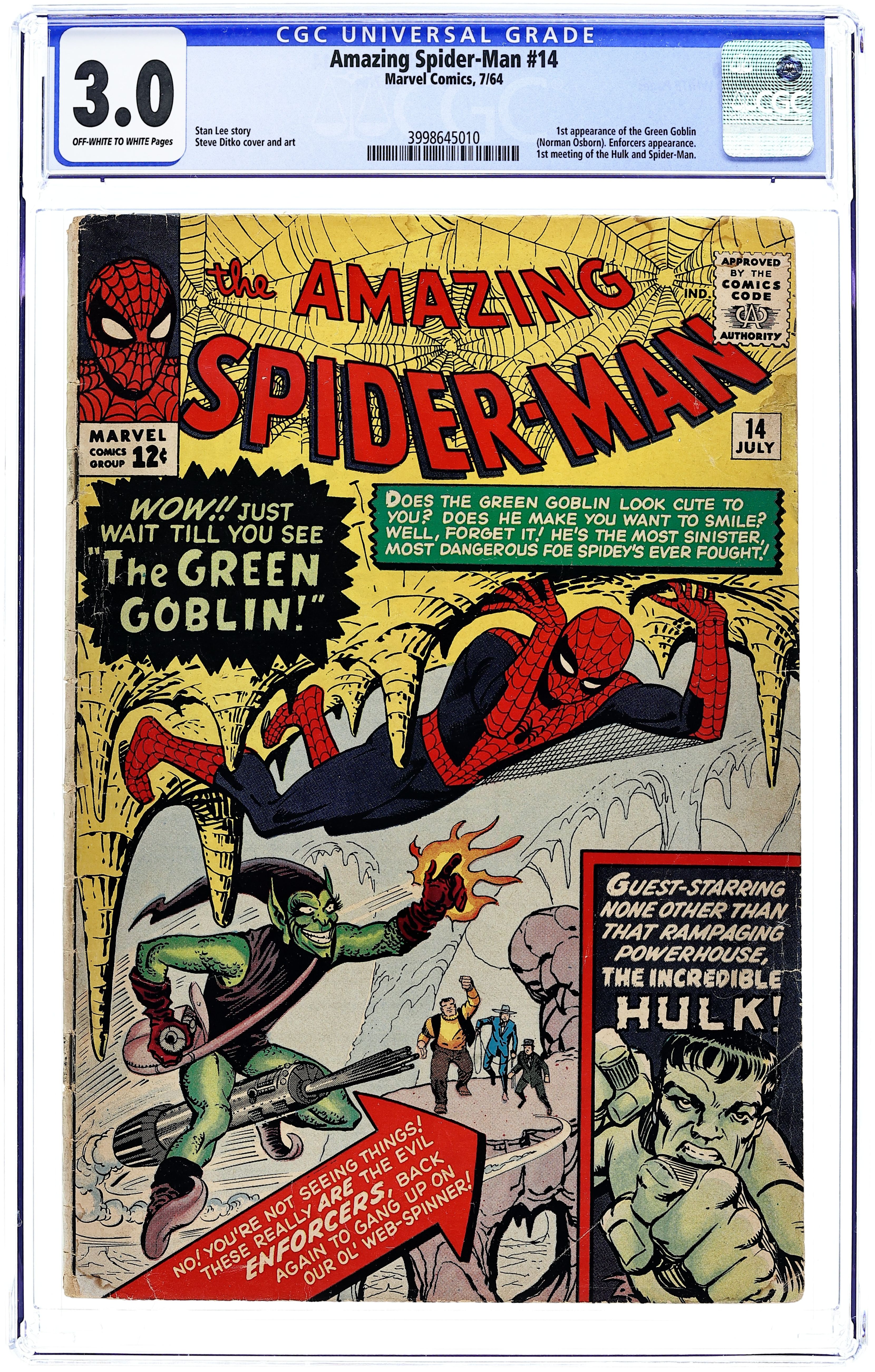 Cover art by Steve Ditko. First appearance of the Green Goblin (Norman Osborn) in The Grotesque Adventure of the Green Goblin!, script by Stan Lee, art by Steve Ditko; The Green Goblin hires the Enforcers to help him defeat Spider-Man; To further his plan he convinces B.J. Cosmos to film a movie of Spider-Man fighting Goblin and the Enforcers in the desert; While filming, Goblin and the Enforcers attack Spider-Man and accidentally awaken the Hulk. Reprinted in Marvel Tales # 9 and 152. 36 pgs. $0.12. Cover price $0.12. Grade: CGC 3.0 explanation of grade Condition: Used (collectible)