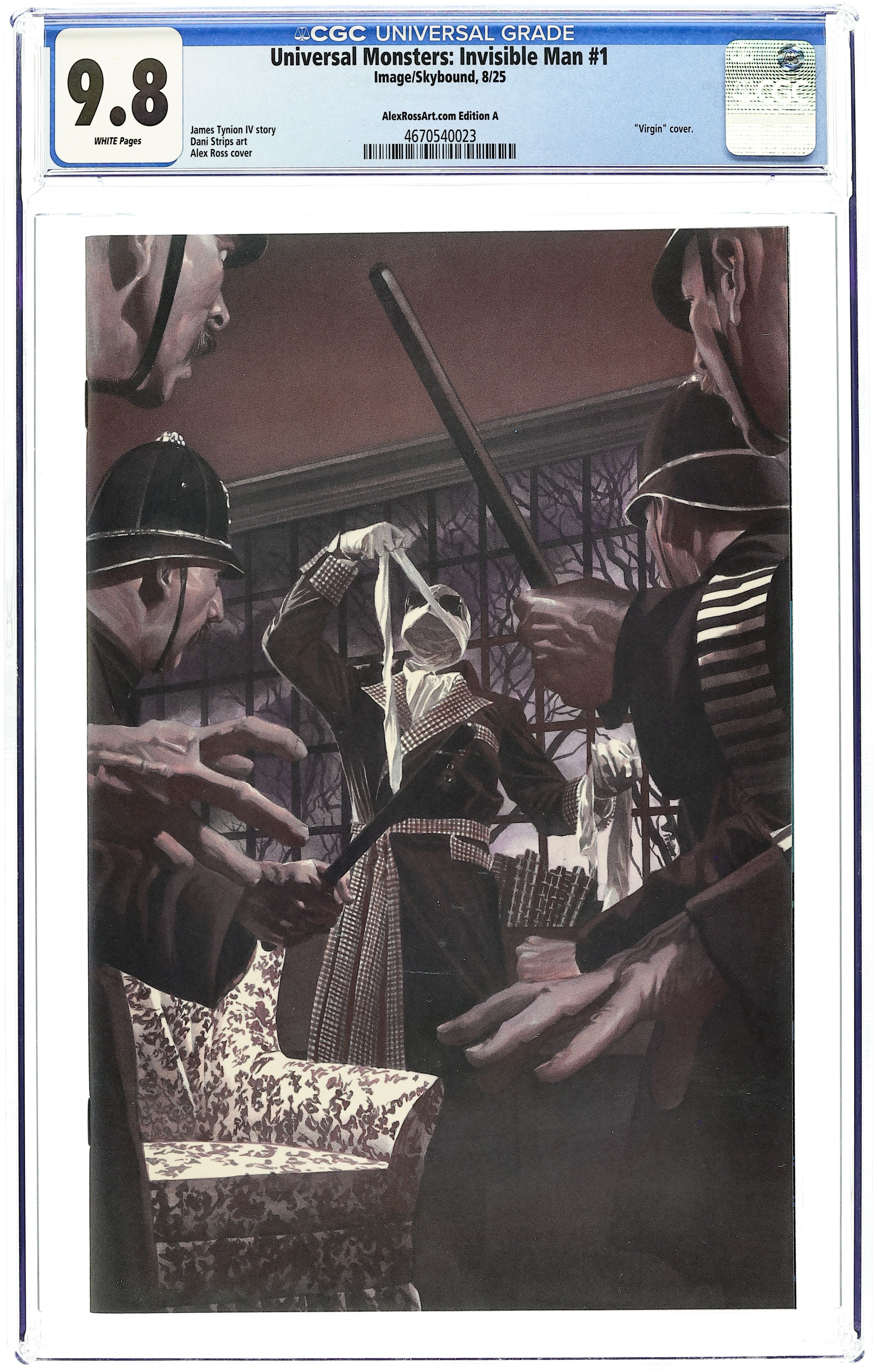Alex Ross Collector's Club Exclusive "Full Color" Virgin Cover by Alex Ross. Written by James Tynion IV. Art by Dani, Brad Simpson. MINISERIES PREMIERE JAMES TYNION IV & DANI RESSURECT A HORROR ICON! ** Jack Griffin has always been invisible to the people around him—at least in his own mind. But when an experimental breakthrough presents a path to make his dreams of invisibility a reality, no one—not even the woman he loves—will stand in his way. Witness Griffin's legendary descent into madness as his humanity fades away and the monster inside is revealed, leaving only...THE INVISIBLE MAN! The horror dream team of JAMES TYNION IV (SOMETHING IS KILLING THE CHILDREN, EXQUISITE CORPSES) and DANI (The Low, Low Woods**) reveal their vision for one of the most horrific monsters in cinematic history! 32 pages, full color. Rated T+ Grade: CGC 9.8 explanation of grade Condition: Used (collectible) unless item is a new release