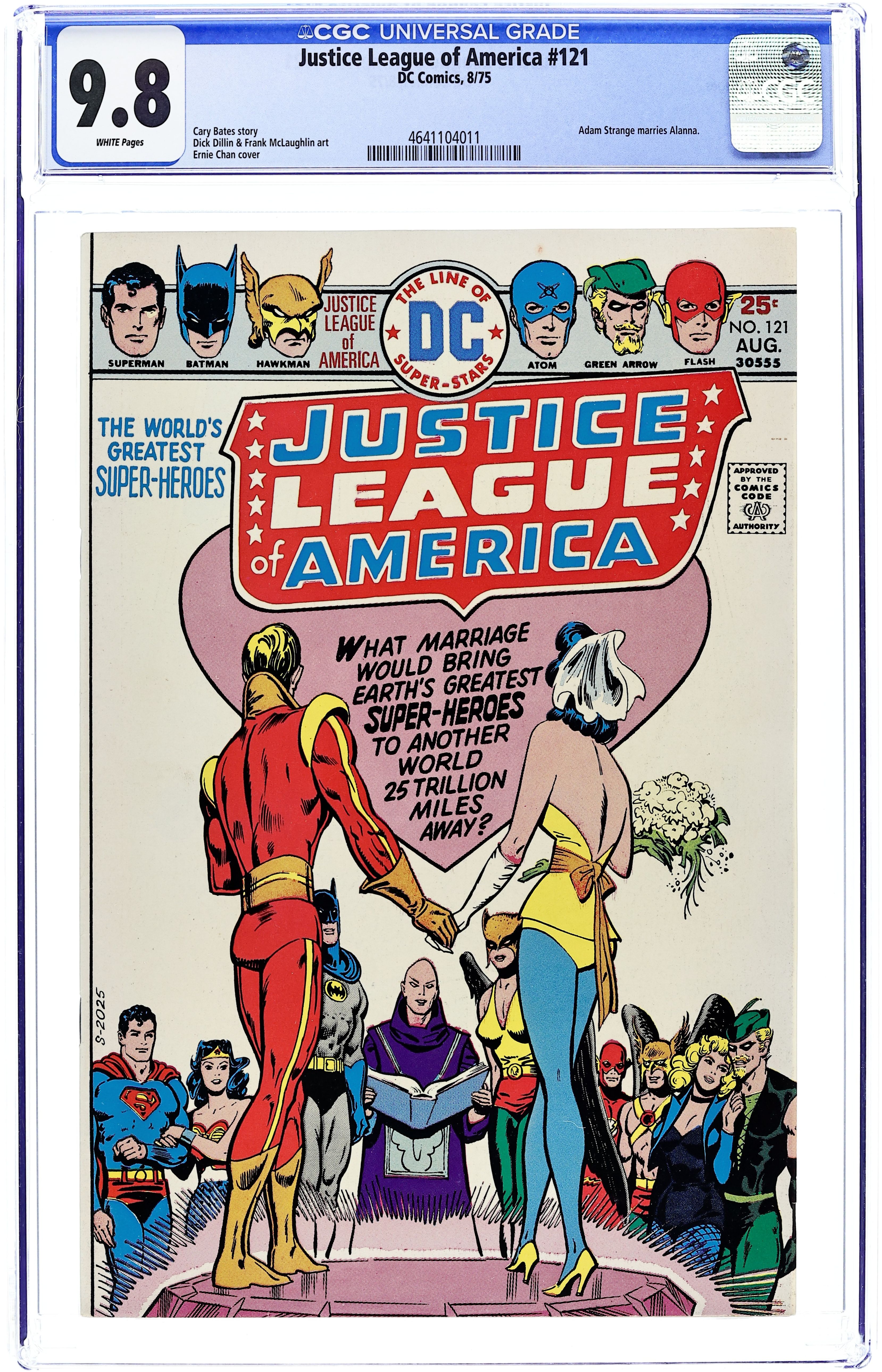 Cover art by Ernie Chan. The Hero Who Jinxed the Justice League!, script by Cary Bates, pencils by Dick Dillin, inks by Frank McLaughlin; Adam Strange marries his long-time sweetheart, Alanna; Kanjar Ro guest-stars. 32 pgs. $0.25. Cover price $0.25. Grade: CGC 9.8 explanation of grade Condition: Used (collectible)