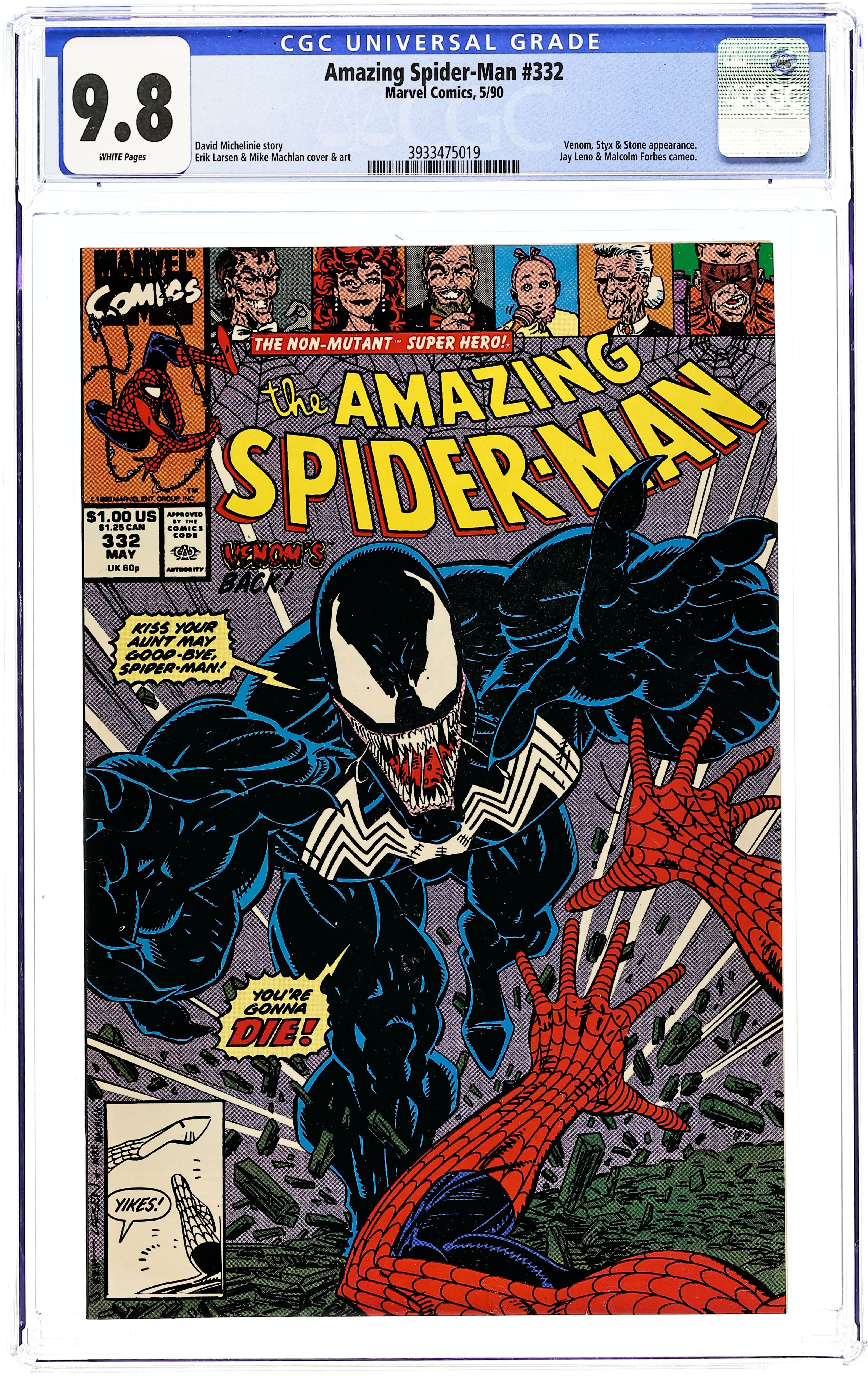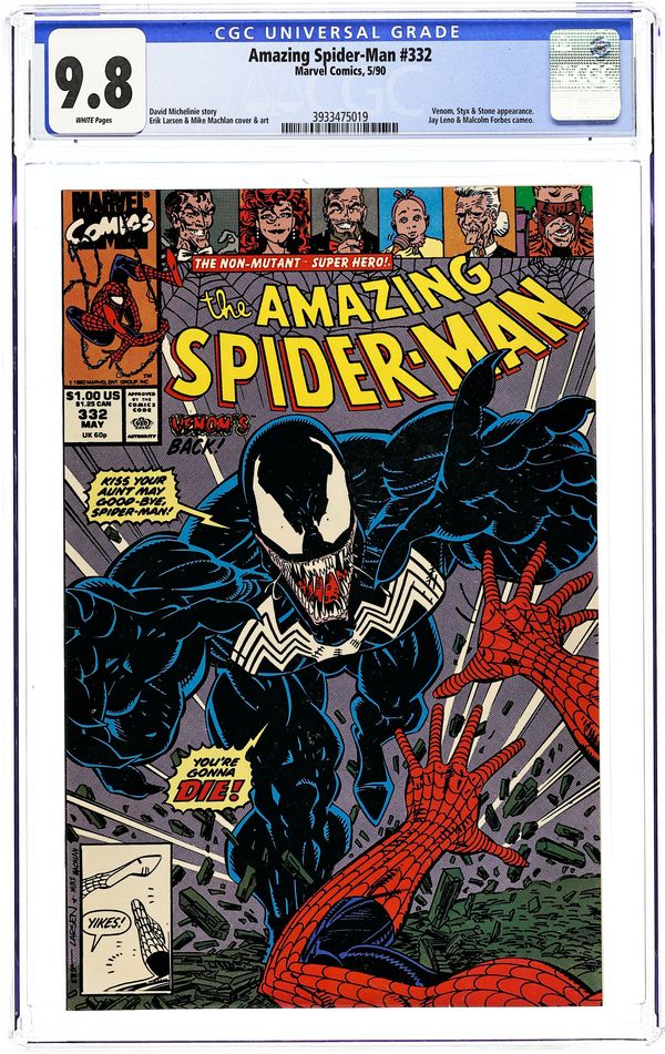 Direct Edition. "Sunday in the Park with Venom" Part 1 of 2. Script by David Michelinie. Pencils by Erik Larsen. Inks by Mike Machlan, Jack Abel, Keith Wilson, Keith Williams, Brad Vancata, Joe Rosas, and Mickey Ritter. Cover by Erik Larsen and Mike Machlan. The web-slinger's worst nightmare is back again! Venom! And so is Mary Jane's! Jonathan Caesar! Add Styx and Stone to the volatile mix and the Parkers are in for a very rough day! The Amazing Spider-Man battles the psychotic Venom in Central Park, while Mary Jane confronts the deranged Caesar at Bedford Towers! Could the wall-crawler and his wife score a double victory against their respective nemeses? Mary Jane has a chance; Spider-Man not so much. Cameo appearances by Aunt May, Jimmy Olsen, Jay Leno, and Malcolm Forbes. (Note: The letters page contains a statement of ownership: average print run 426,790; average paid circulation 266,100.) 36 pages. Cover price $1.00. Grade: CGC 9.8 explanation of grade Condition: Used (collectible)