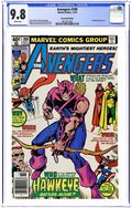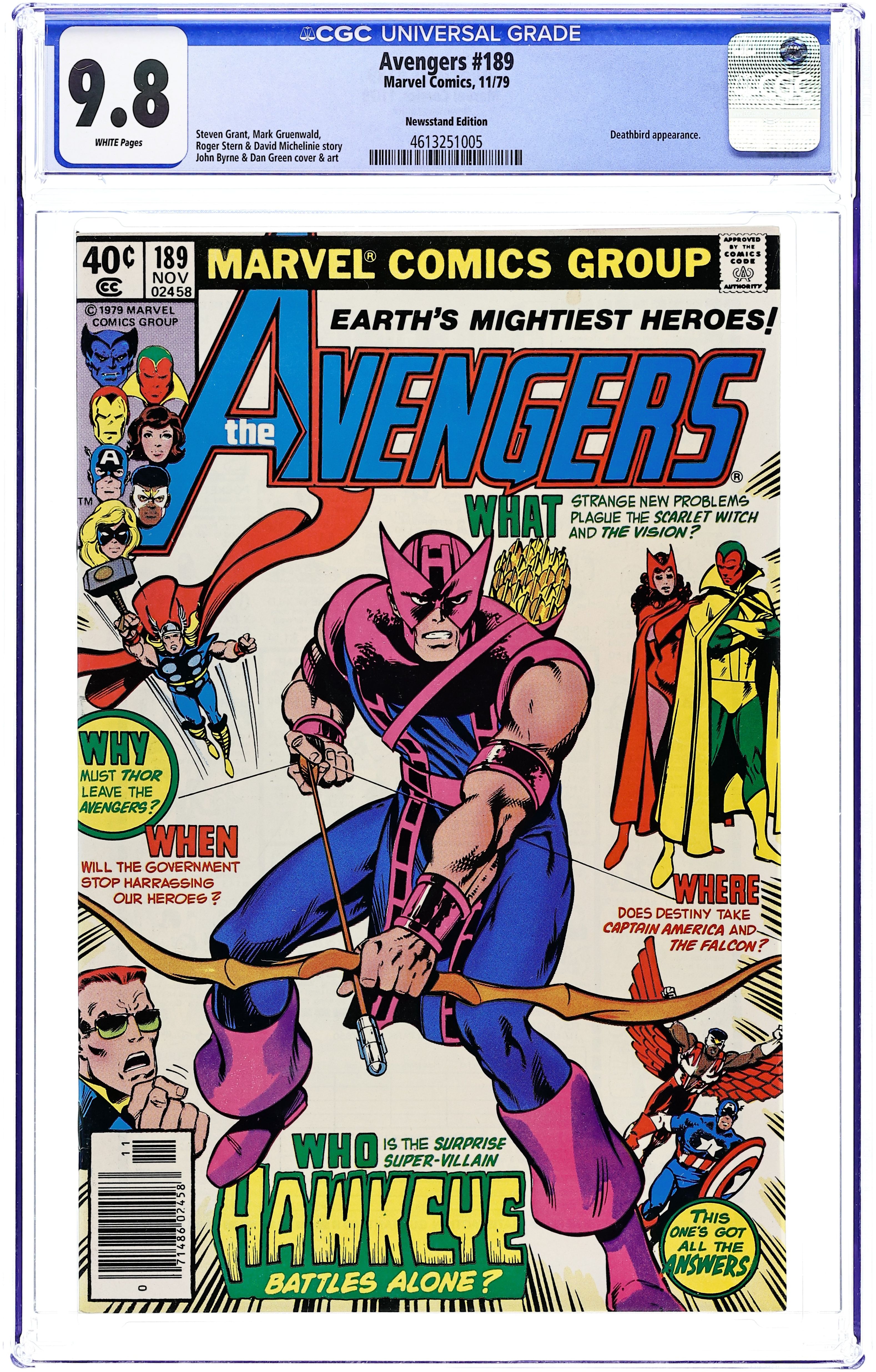 Newsstand Edition. "Wings and Arrows!" Plot by Steven Grant, Mark Gruenwald and Roger Stern. Script by Steven Grant. Pencils by John Byrne. Inks by Dan Green. Cover by John Byrne and Terry Austin. The Avengers' titanic tussle with Arsenal (in Avengers Annual 9) is over. And now the team is getting back to normal and re-establishing the government-mandated seven person roster. But Clint Barton is not on that roster, so the Avengers' former ace archer must find another job. Hawkeye receives a nice lead from Jarvis and lands a security position with Cross Enterprises! However trouble isn't too far behind, and just a few days later Hawkeye gets to strut his stuff vs. the Shi'ar warrior...Deathbird! Cameo appearances by Peter Gyrich and Jocasta. (Notes: Deathbird appears next in Uncanny X-Men 155.) 36 pages Cover price $0.40. Grade: CGC 9.8 explanation of grade Condition: Used (collectible)