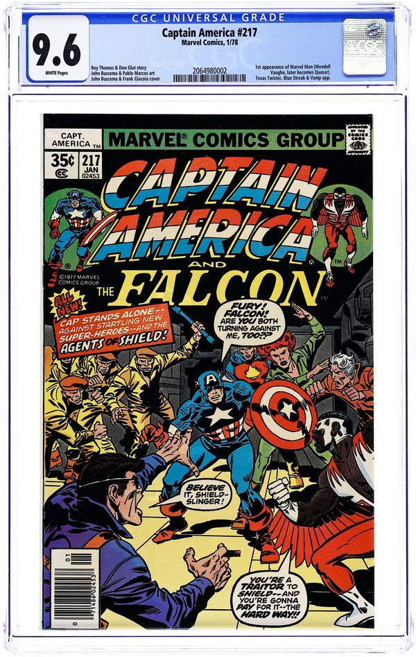 First appearance of Quasar (aka Marvel Man) in "The Search for Steve Rogers!" Plot by Roy Thomas. Script by Don Glut. Pencils by John Buscema. Inks by Pablo Marcos. Cover by John Buscema and Frank Giacoia. Captain America and the Falcon visit SHIELD's underground complex in Midtown...and meet the new Super-Agents of SHIELD! Nick Fury has been concerned about a shadowy organization called: The Corporation, so he recently assembled his own team of super-powered operatives. They are: the Blue Streak, Marvel Boy (aka Wendell Vaughn), the Texas Twister, and the Vamp. And now the Director of SHIELD wants the Sentinel of Liberty to put the new Super-Agents to the test! Four against one! This should be a piece of cake for the star-spangled avenger! First appearances of the Blue Streak and the Vamp. Cameo appearances by Dum Dum Dugan, Sharon Carter, Senator Kligger Stivak, Veda, and Redwing. (Notes: Wendell Vaughn was only called Marvel Boy in issue 217. Redwing appears for the first time since Captain America 191.) 36 pages. Cover price $0.35. Grade: CGC 9.6 explanation of grade Condition: Used (collectible)