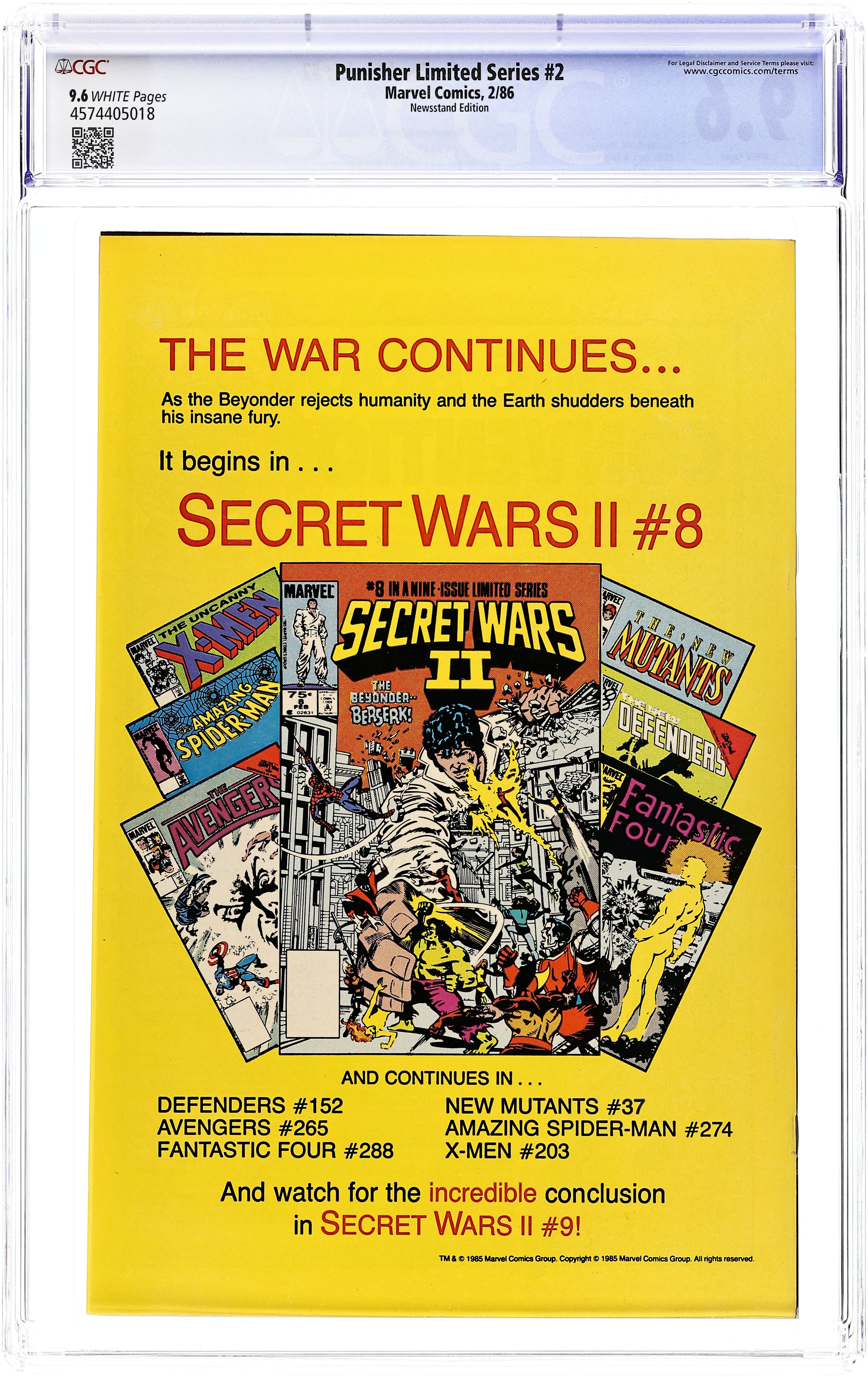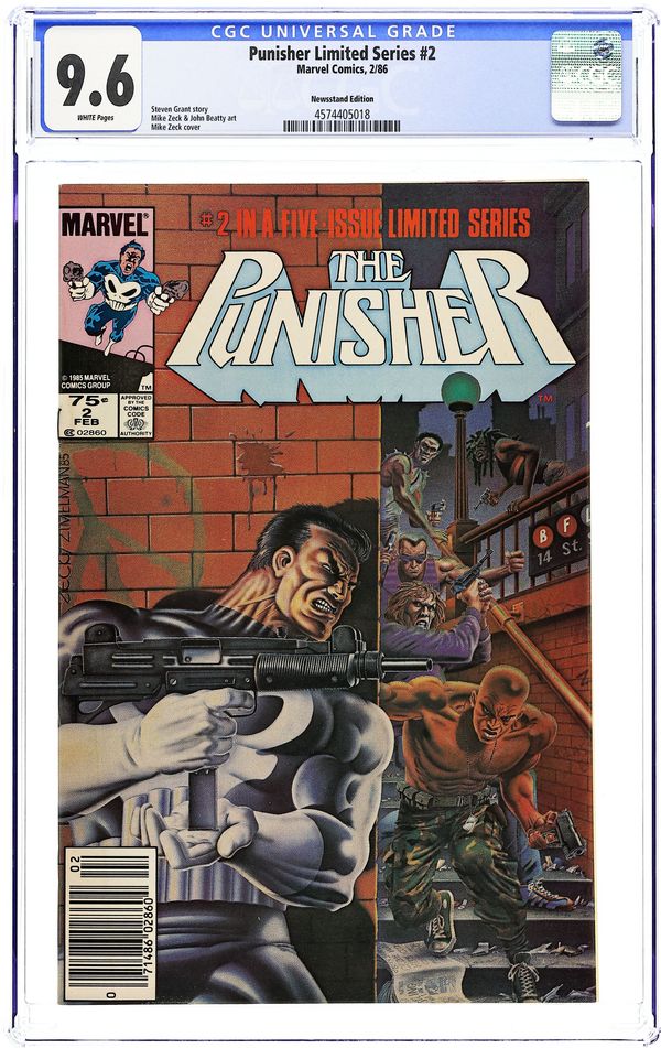 Newsstand Edition. "Back to War!" Story by Steven Grant. Art by Mike Zeck and John Beatty. Cover by Mike Zeck and Phil Zemelman. NOTE: War Journal Entry: #1053. Out of jail, thanks to The Trust, the Punisher sets out to take out the biggest criminal of them all – the Kingpin. Cover price $0.75. Grade: CGC 9.6 explanation of grade Condition: Used (collectible)