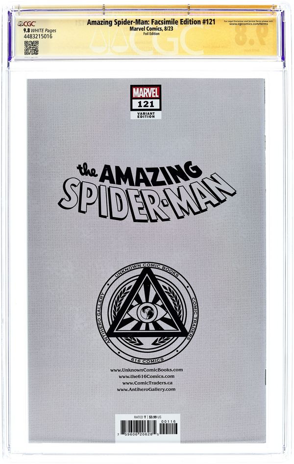 Starts Feb 2 Comics Illuminati (Unknown Comics, The 616 Comics, AntiHero Gallery, and Comic Traders) Exclusive Foil Cover by John Romita Sr. Written by Gerry Conway. Art by Gil Kane. The night Gwen Stacy died! In 1973, Spider-Man fans the world over were shocked by a story that had previously been unthinkable. To strike at the heart of Peter Parker, the Green Goblin kidnaps the woman he loves, Gwen Stacy, and Spider-Man faces a race against time as he swings to the rescue. Readers were used to Spidey saving the day - and as the Goblin sends Gwen plummeting from a bridge, our hero believes he has done it again, firing out a webline that breaks her fall. But when Peter holds Gwen in his arms, the heartbreaking truth is revealed - and comic books are changed forever! It's a masterpiece of storytelling from Gerry Conway and Gil Kane, and one of the all-time great Marvel comic books, boldly re-presented in its original form, ads and all! Reprinting AMAZING SPIDER-MAN (1963) #121. 32 pages, full color. Rated T Grade: CGC 9.8 explanation of grade Condition: Used (collectible)