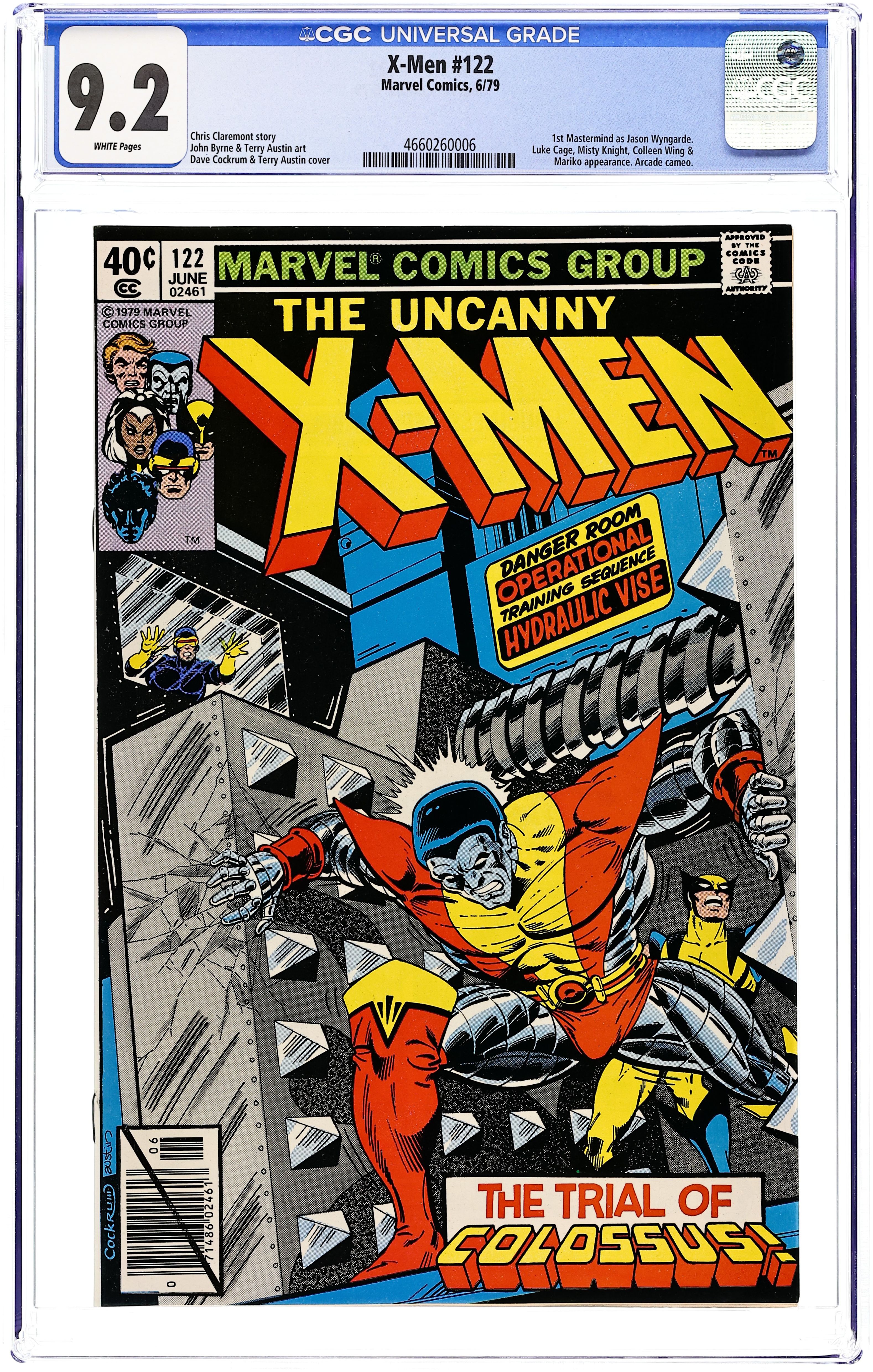 Direct Edition. "Cry for the Children!" Cameos by Luke Cage, Misty Knight, Colleen Wing , Black Tom Cassidy, and Juggernaut. Story by Chris Claremont and John Byrne. Art by John Byrne and Terry Austin. Cover by Dave Cockrum and Terry Austin. While testing the limits of his incredible strength in the Danger Room, Colossus learns a valuable lesson about courage from Wolverine. Meanwhile, Jean Grey meets the mysterious man that will change her life forever, Jason Wyngarde. Plus, Storm learns a hard truth about life on the streets. 36 pgs. Cover price $0.40. Grade: CGC 9.2 explanation of grade Condition: Used (collectible)
