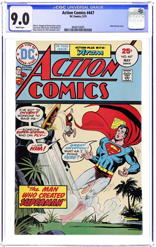 Cover by Dick Giordano. "The Man Who Created Superman!", script by Elliot S! Maggin, pencils by Curt Swan, inks by Bob Oksner; An island hermit with second sight helps Superman defuse a deadly solar energy bomb. "The Girl With The 24-Karat Dreams!", script by Martin Pasko, pencils by Rich Buckler, inks by Klaus Janson; Enrichetta Negrini finds she has the apparent power to turn whatever or whoever she dreams of into solid gold, including her fiancé, and the Atom takes a hand... only to find that his hand has also turned into gold. 36 Pages, Full Color, $0.25. Cover price $0.25. Grade: CGC 9.0 explanation of grade Condition: Used (collectible)