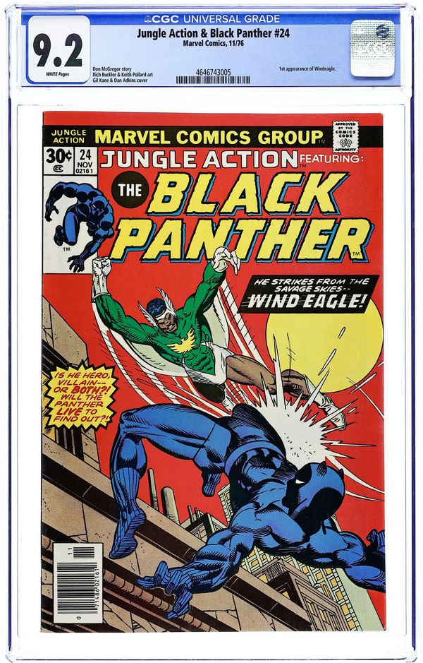 Final issue of the series. Cover pencils by Gil Kane, inks by Dan Adkins. Wind Eagle in Flight, script by Don McGregor, pencils by Rich Buckler (layouts, pages 1-13) and Keith Pollard (finishes pages 1-13, pencils pages 14-17), inks by Keith Pollard; Leroy Ames gives his version of the events leading to Angela's death; Wind Eagle attacks the Panther and ties him to a mill wheel. Letters from comics creators Robert Rodi, Ann Nichols and Helmsman Collins. 36 pgs., full color. Cover price $0.30. Grade: CGC 9.2 explanation of grade Condition: Used (collectible)