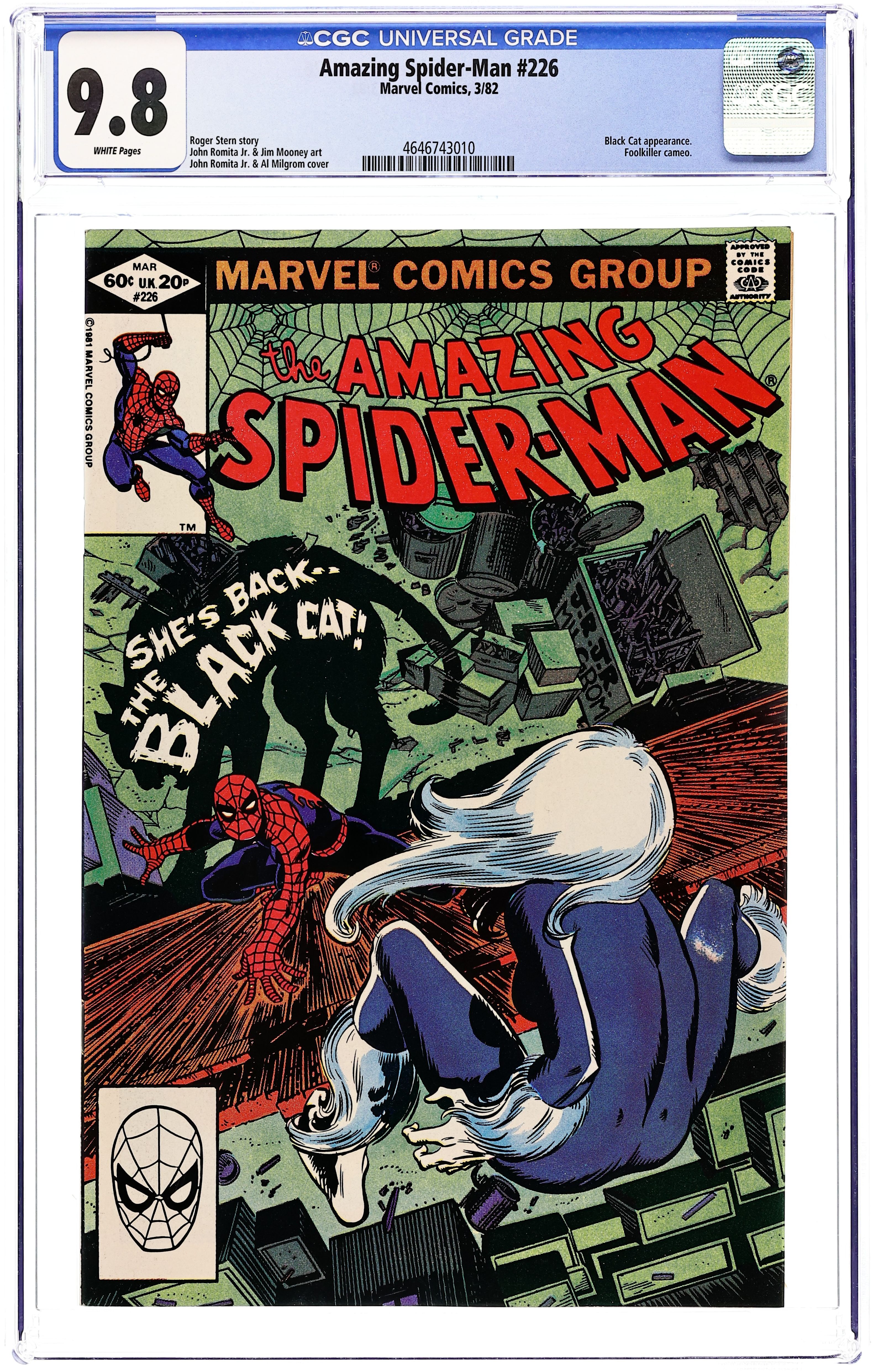 Direct Edition. "But the Cat Came Back" Part 1 of 2. Script by Roger Stern. Art by John Romita Jr. (breakdowns) and Jim Mooney (finishes). Cover by John Romita Jr. and Al Milgrom. Because the fans demanded her, the Black Cat is back! And flirting and fighting with the web-slinger all over again! After Felicia escapes from the psychiatric hospital, she resumes her high-dollar heists! But soon realizes that it's not as much fun without Spider-Man chasing her! So, the cat burglar extraordinaire arranges an evening rendezvous with her favorite wall-crawler at their first date location (from Amazing Spider-Man 194). Will the enchanting cat mesmerize the Spectacular Spider-Man once more? Or can the web-slinger resist her feline charms? An excellent issue! Cameo appearances by the Foolkiller and Captain Jean DeWolff. (Notes: This was a highly anticipated issue for fans of the wall-crawler; and Stern & Romita Jr. did not disappoint. The Black Cat previously appeared in Amazing Spider-Man 205. This story was reprinted in Spider-Man Magazine 2 and also in the trade paperback: Spider-Man vs. the Black Cat (2005). The back cover features a full-page ad for Dungeons & Dragons with art by Bill Willingham.) 36 pgs. Cover price $0.60. Grade: CGC 9.8 explanation of grade Condition: Used (collectible)
