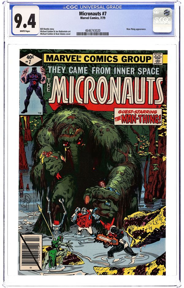 Starts Feb 9 Direct Edition. While hiding in the Everglades, Steve Coffin and the Micronauts are attacked by the Man-Thing, and Baron Karza learns of the existence of Earth and travels through the Prometheus Pit to Earth in "Adventure into Fear!" Characters: Micronauts [Commander Arcturus Rann; Marionette [Princess Mari]; Acroyear; Bug; Microtron; Biotron]; Steve Coffin; Dallan Rann (Flashback); Lady Sepsis (Flashback); Baron Karza; Time Traveler; Man-Thing [Ted Sallis]; Professor Prometheus; Prince Argon; Slug; Shadow Priests; Dog Soldiers; Ray Coffin; Endeavor (Rann's spaceship); The Prometheus Pit. Written by Bill Mantlo and Michael Golden, with art by Michael Golden and Joe Rubinstein. Cover by Michael Golden and Neal Adams. Cover price $0.40. Grade: CGC 9.4 explanation of grade Condition: Used (collectible)