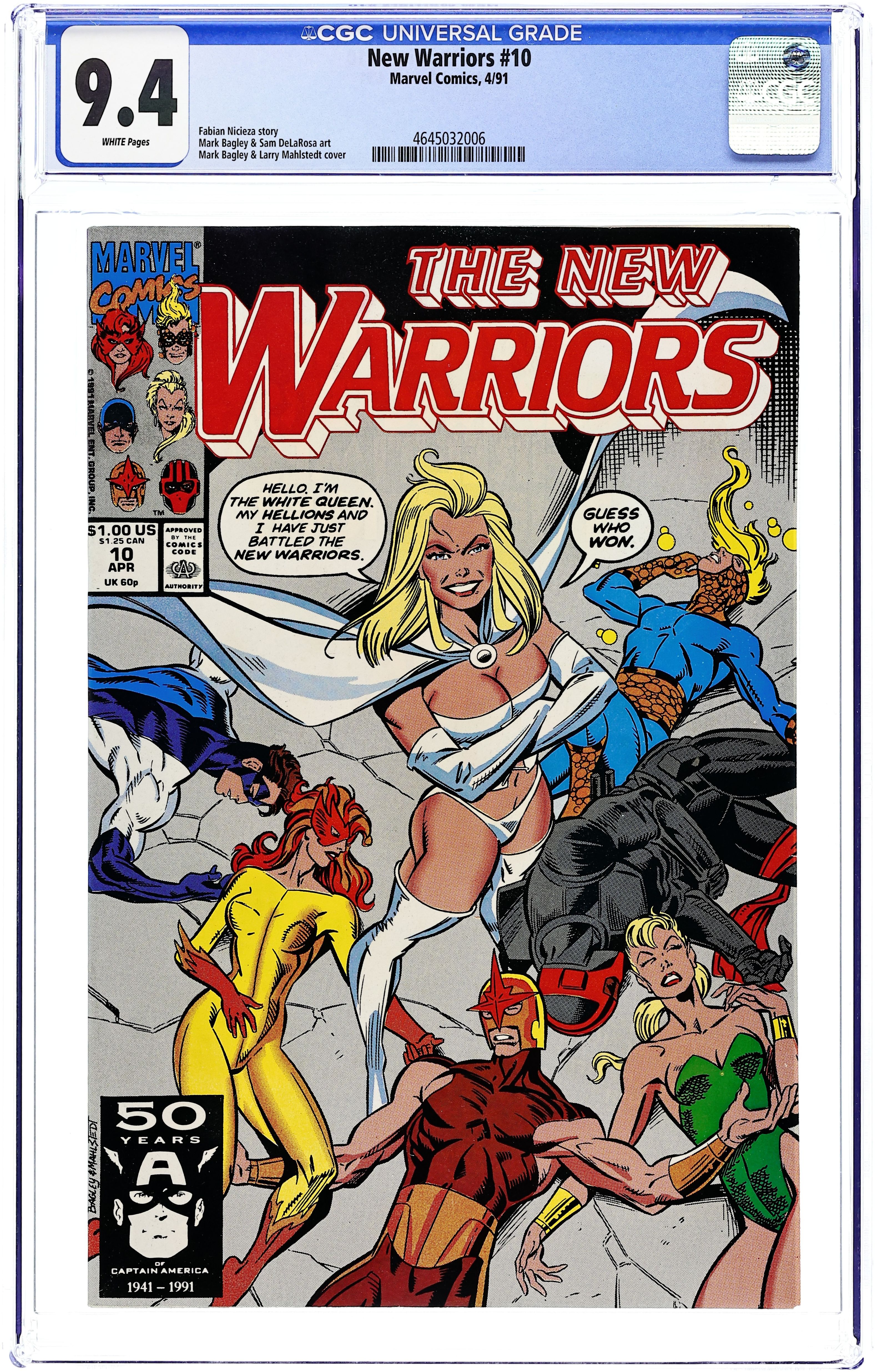 1st printing. "Rumble!" Written by Fabian Nicieza. Art by Mark Bagley and Sam DeLaRosa. The New Warriors face off against the White Queen herself, Emma Frost, and her mutant strike force - the Hellions! 32 pages, FC. Cover price $1.00. Grade: CGC 9.4 explanation of grade Condition: Used (collectible)