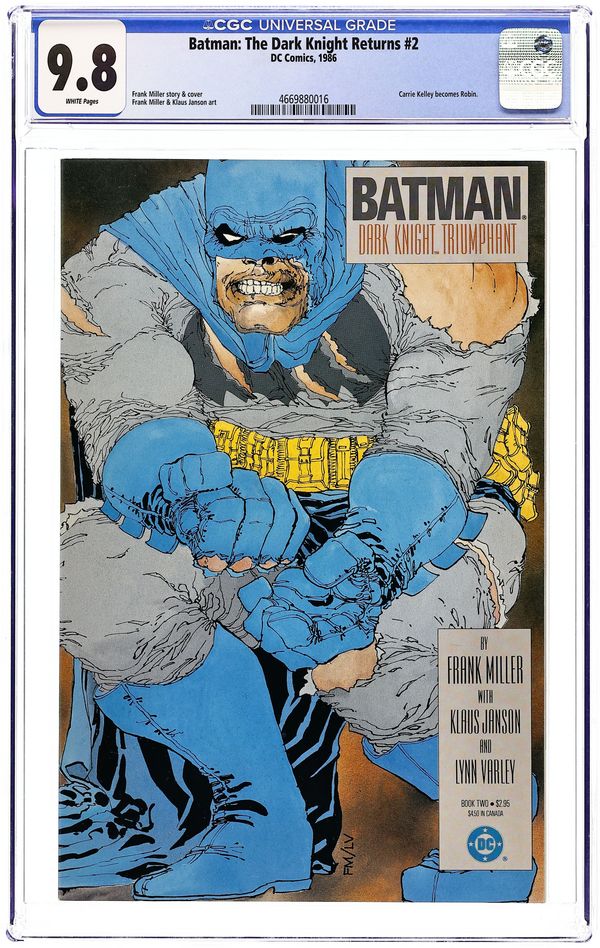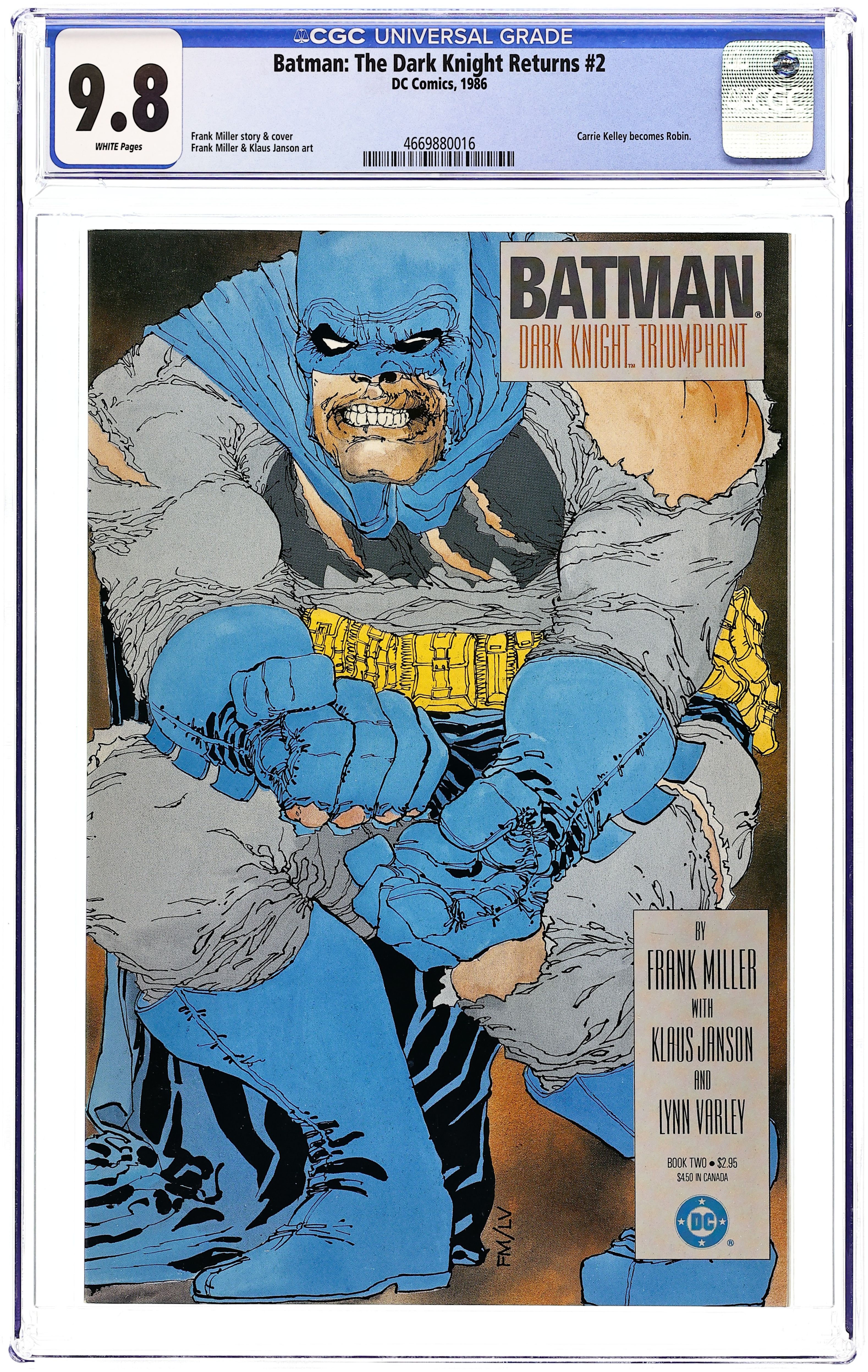 First printing. Direct Edition. NOTE: 1st printing has almost matching grey background on inside front cover and facing page. 2nd printing doesn't have matching gray background--grays are very different. 3rd printings are labeled as such. Cover by Frank Miller. "Dark Knight Triumphant," script by Frank Miller, pencils by Frank Miller, inks by Klaus Janson; an aging Batman battles the Mutant gang and their anonymous leader; While walking to work, considering retirement, Jim Gordon is almost killed by a 17-year old boy with an M60; Carrie Kelly, a young girl who owes her life to Batman, seeks out her hero and becomes Robin. 52 pgs., full color. Cover price $2.95. Grade: CGC 9.8 explanation of grade Condition: Used (collectible)