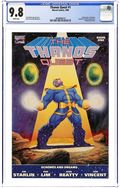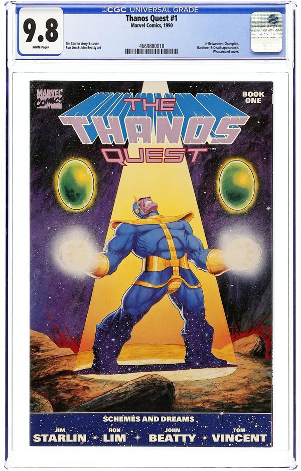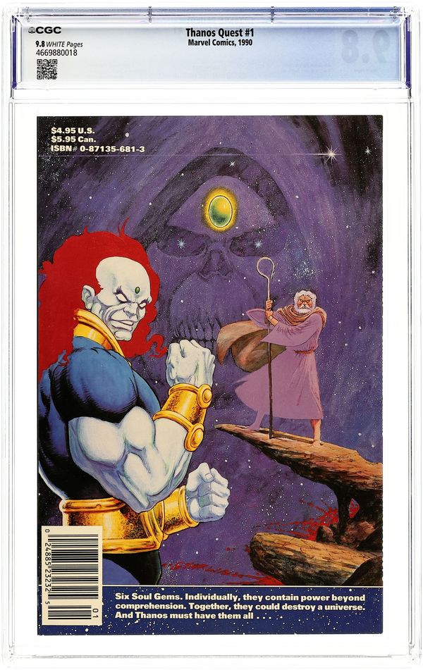 1st Printing. "Schemes and Dreams!" Written by Jim Starlin. Art by Ron Lim John Beatty. Six Soul Gems. NOTE: This tale picks up after the events of Silver Surfer (1987 2nd Series) #38. Thanos the Mad Titan has been resurrected by the entity known as Death. Resurrected and given a dark mission. In order to accomplish this mission, Thanos will seek ultimate power - the Soul Gems! Individually, they contain power beyond comprehension. Together, they could destroy a universe. And Thanos must have them all.… Featuring the Elders of the Universe Champion and Gardiner, and the nefarious In-Betweener. 48 pages, FC Cover price $4.95. Grade: CGC 9.8 explanation of grade Condition: Used (collectible)