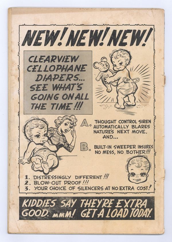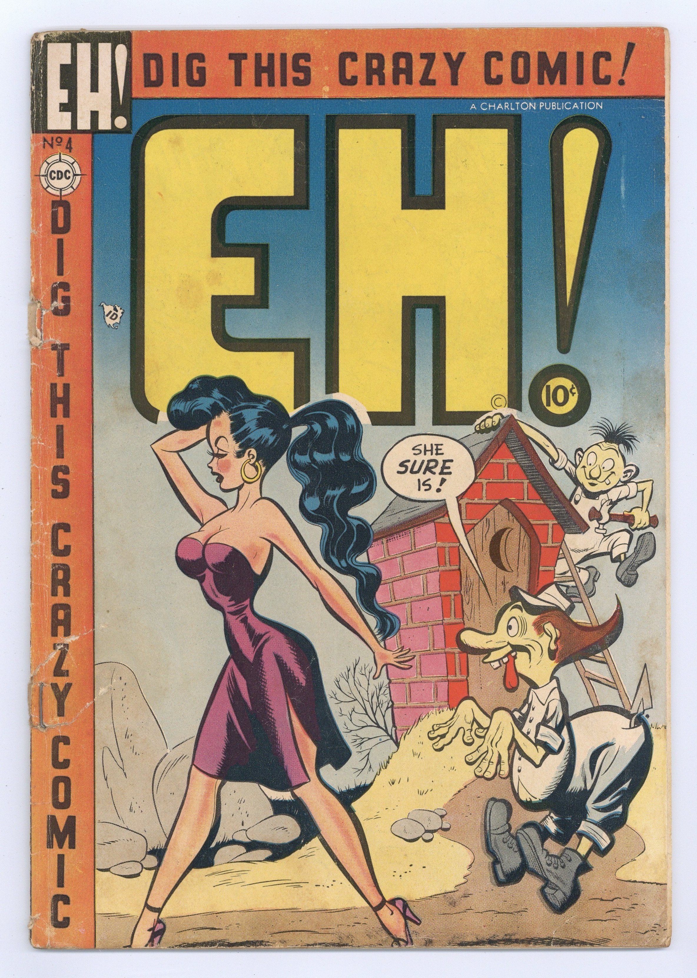Stories and art by Dick Ayers, Fred Ottenheimer, and Rocco "Rocke" Mastroserio. Eh! was Charlton's attempt at a one-word-title humor and satire comic, inspired by the success of EC's Mad. A boxing manager needing a new fighter looks for the toughest guy he can find, but they all have some hidden weakness. Hoiman the cab driver faces the strange and dangerous challenges of picking up a day's fares in the city. Eh! does a version of Longfellow's "Paul Revere's Ride," just as Mad did a year later. Spoofs of 1950s advertising, including cigarettes, deodorant ("He smells like a gymnasium!"), and "Cellophane Diapers" - as Alfred E. Neuman would say, "Yecch!" The cover features an unprintable visual pun. Be Hacky - Go Nutz; A Million Dollar Gate!; Taxi, Lady?; Eh-!?!; Herman's Hazard; The Ride of Paul Revere!; Histerical News!; Don't Be Aloof...; Clearview Cellophane Diapers. 32 pages, Full Color. Cover price $0.10. Grade: PR 0.5 explanation of grade Condition: Used (collectible)