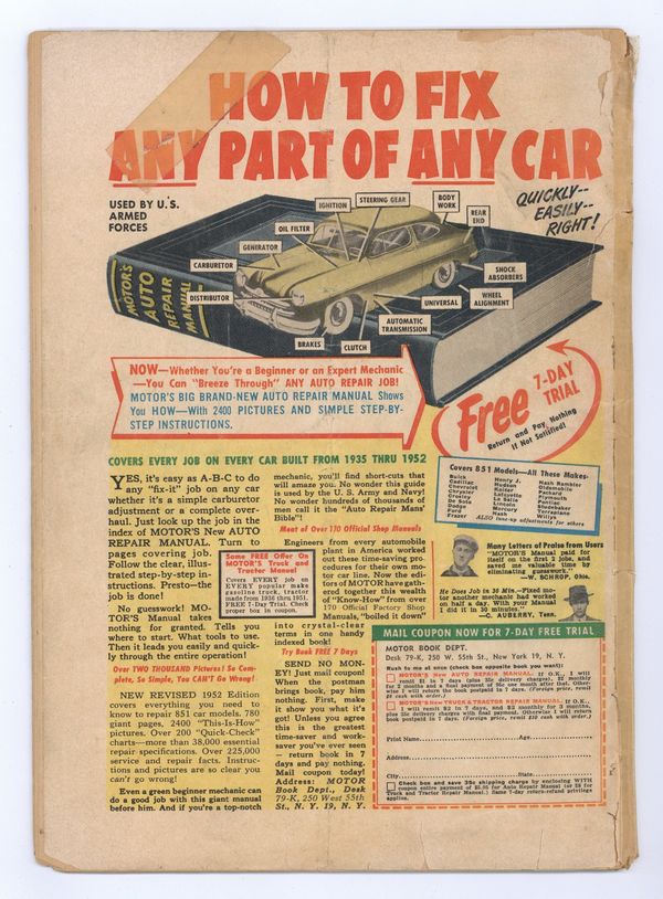 Cover art by Wally Wood. Well-Traveled!, script by Bill Gaines (co-plot) and Albert B. Feldstein (co-plot, script), art by Jack Kamen; A henpecked husband dis-members his wife after she refuses to let him spend money on toy trains once too often. Hate!, script by Albert B. Feldstein, art by Wally Wood; A man goes along with a plan to set fire to a Jewish couple's home until his mother tells him he's adopted and that his natural parents were Jews. Justice text story by Albert B. Feldstein. What Fur?, script by Albert B. Feldstein, art by Joe Orlando; Captain Limpfort is hired by a furrier to fly him to a planet in another Solar System in order for the furrier to trap and skin skunks, which he makes into fashion apparel. Cold Cuts!, script by Albert B. Feldstein, art by Jack Davis; A man murders his wife and cuts up her body in the tub to store in the meat locker. 36 pgs. $0.10. Cover price $0.10. Grade: PR 0.5 explanation of grade Condition: Used (collectible)